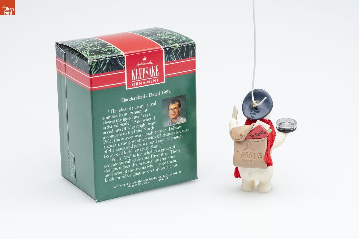 Hallmark / KEEPSAKE / ORNAMENT / Handcrafted - Dated 1992 / "The idea of putting a real / compass in an ornament / always intrigued me," says / artist Ed Seale. "And when I / asked myself who might want / a compass to find the North / Pole, the answer was a mail carrier. I always / associate the post office with Christmas because / of the cards and gifts we send and, of course, / because of kids' letters to Santa." / "Polar Post" is included in a group of / ornaments called Artists' Favorites. These / designs reflect the personal interests and / memories of the artists who create them. / Look for Ed's signature on this ornament. / Mfd. for and (C) 1992 Hallmark Cards, Inc., K.C., MO 64141 / Made in Sri Lanka QX491-4