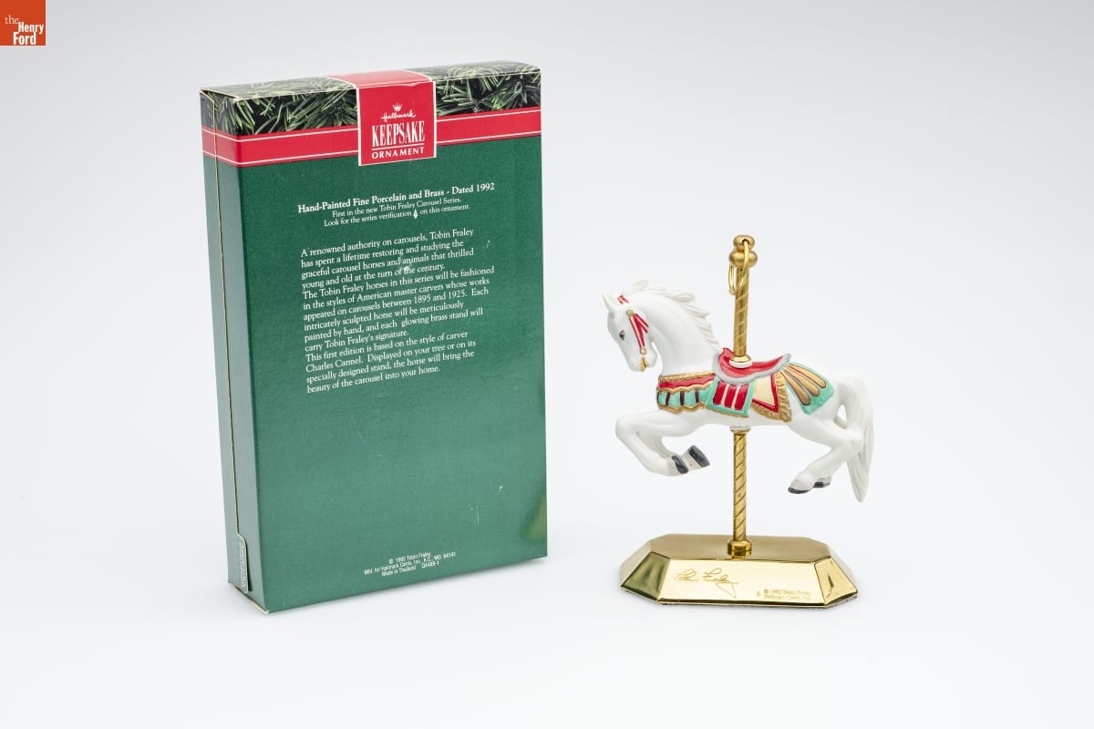 Hallmark / KEEPSAKE / ORNAMENT / Hand-Painted Fine Porcelain and Brass - Dated 1992 / First in the new Tobin Fraley Carousel Series. / Look for series verification 1 on this ornament. / A renowned authority on carousels, Tobin Fraley / has spent a lifetime restoring and studying the / graceful carousel horses and animals that thrilled / young and old at the turn of the century. / The Tobin Fraley horses in this series will be fashioned / in the styles of American master carvers whose works / appeared on carousels between 1895 and 1925. Each / intricately sculpted horse will be meticulously / painted by hand, and each glowing brass stand will / carry Tobin Fraley's signature. / This first edition is based on the style of carver / Charles Carmel. Displayed on your tree or on its / specially designed stand, the horse will bring the / beauty of the carousel into your home. / (C) 1992 Tobin Fraley / Mfd. for Hallmark Cards, Inc, K.C., MO 64141 / Made in Thailand QX489-1