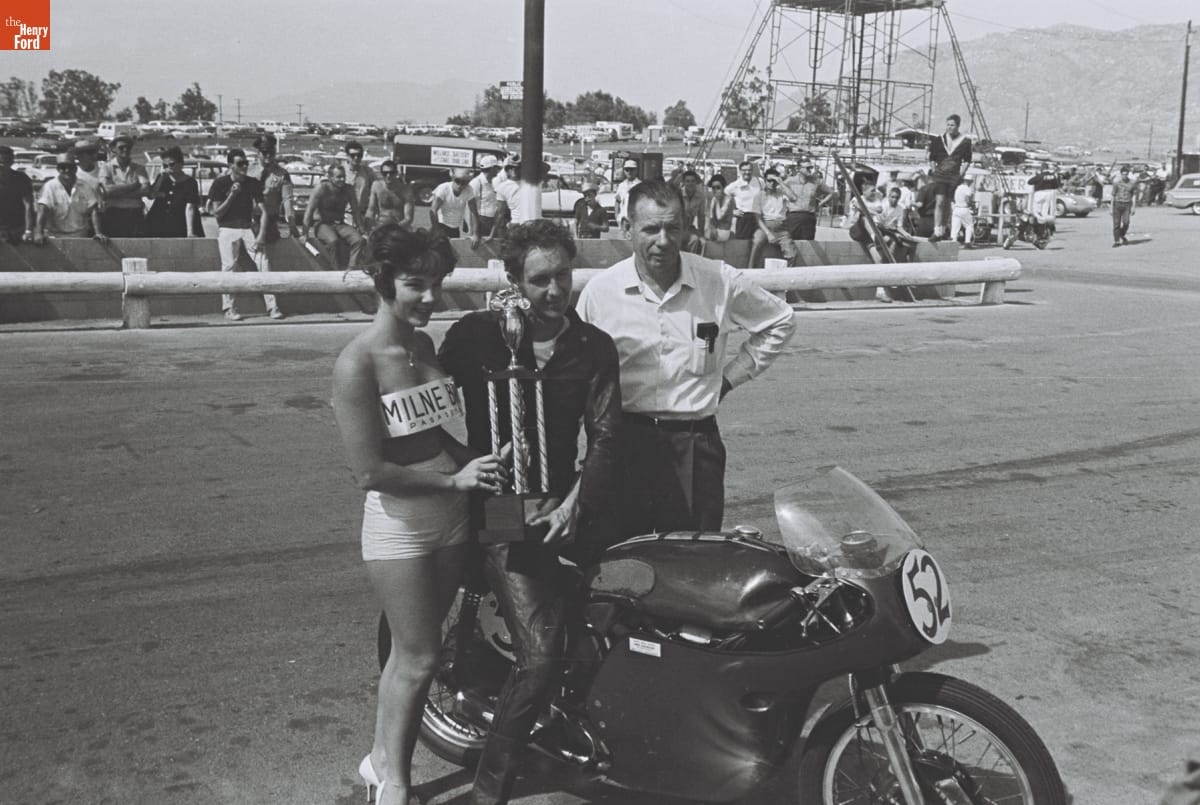 Winner of the Motorcycle Race before the 4th Annual Grand Prix for Sports Cars, Riverside, California, October 1961