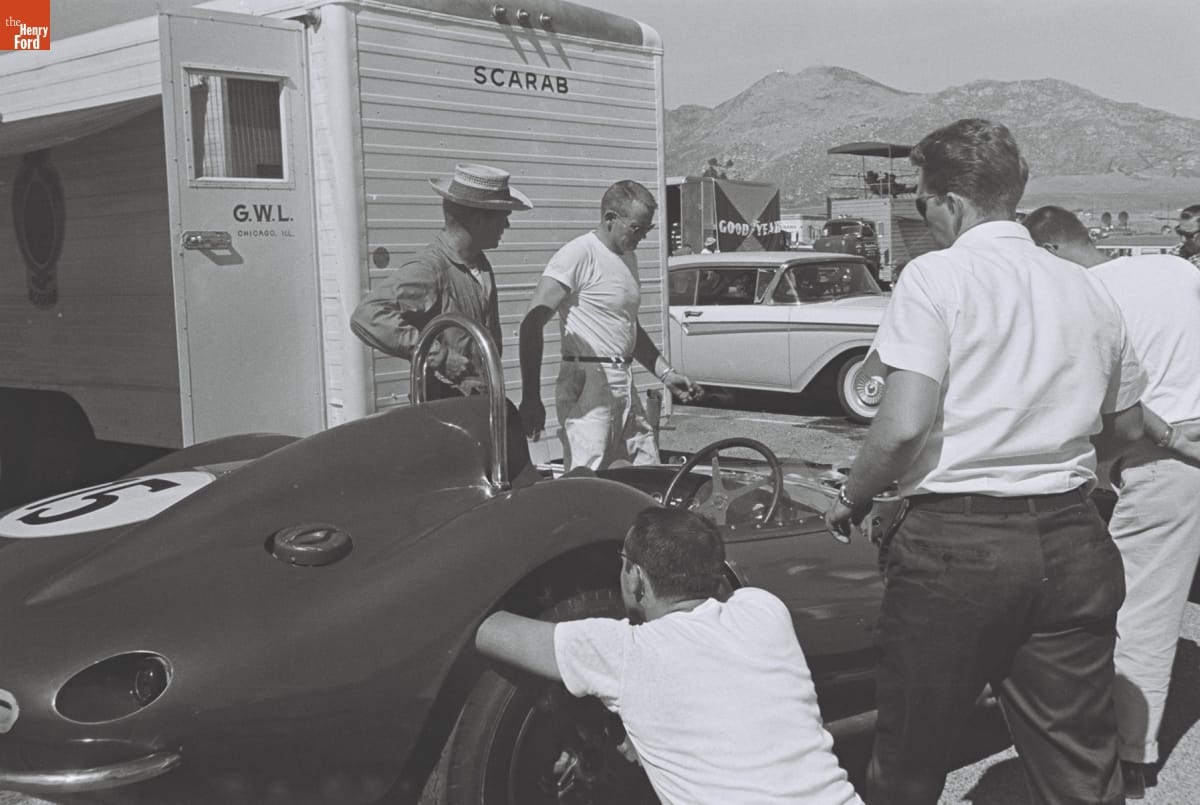 Preparing for the 4th Annual Grand Prix for Sports Cars, Riverside, California, October 1961