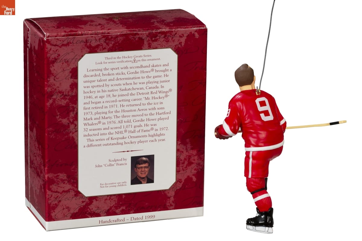 Third in the Hockey Greats Series. / Look for series verification 3 on this ornament. / Learning the sport with secondhand skates and / discarded, broken sticks, Gordie Howe brought a / unique talent and determination to the game. He / was spotted by scouts when he was playing junior / hockey in his native Saskatchewan, Canada. In / 1946, at age 18, he joined the Detroit Red Wings / and began a record-setting career. "Mr. Hockey" / first retired in 1971. He returned to the ice in / 1973, playing for the Houston Aeros with sons / Mark and Marty. The three moved to the Hartford / Whalers in 1976. All told, Gordie Howe played / 32 seasons and scored 1,071 goals. He was / inducted into the NHL Hall of Fame in 1972. / This series of Keepsake Ornaments highlights / a different outstanding hockey player each year. / Sculpted by / John "Colliin" Francis / For decorative use only. / Not for young children. / Handcrafted - Dated 1999