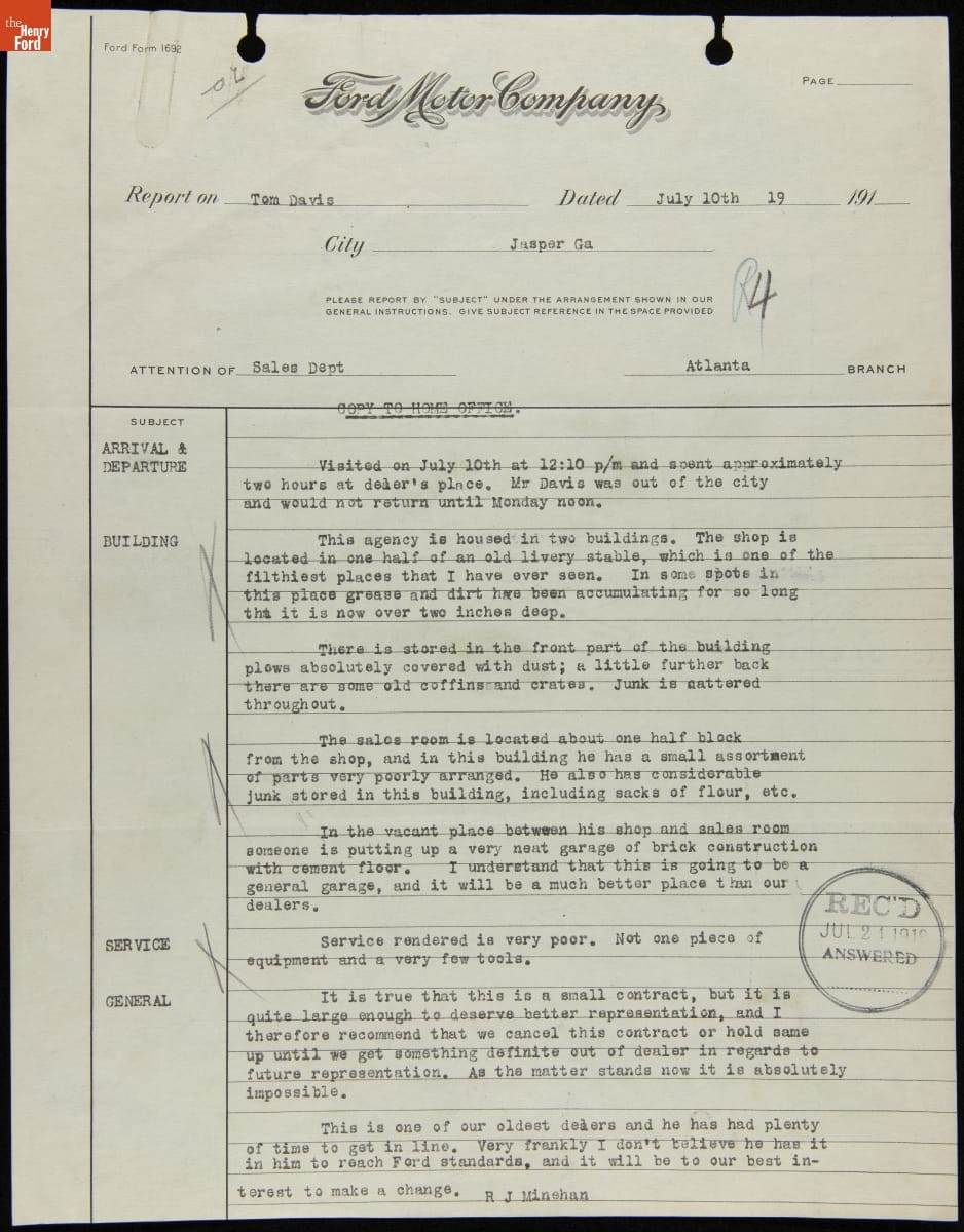 Manager Report Recommending the Cancellation of Tom Davis Sales Contract, Jasper, Georgia, July 10, 1919