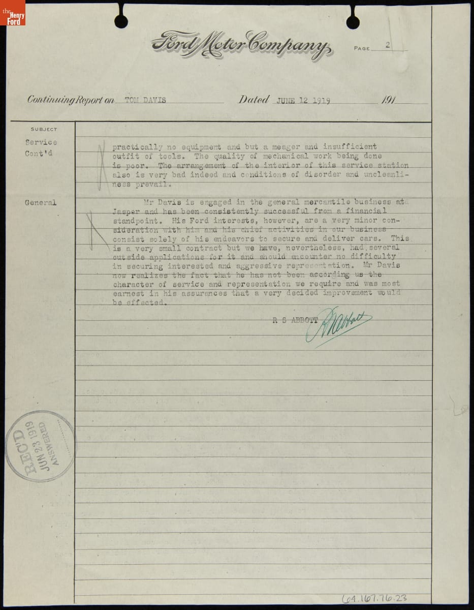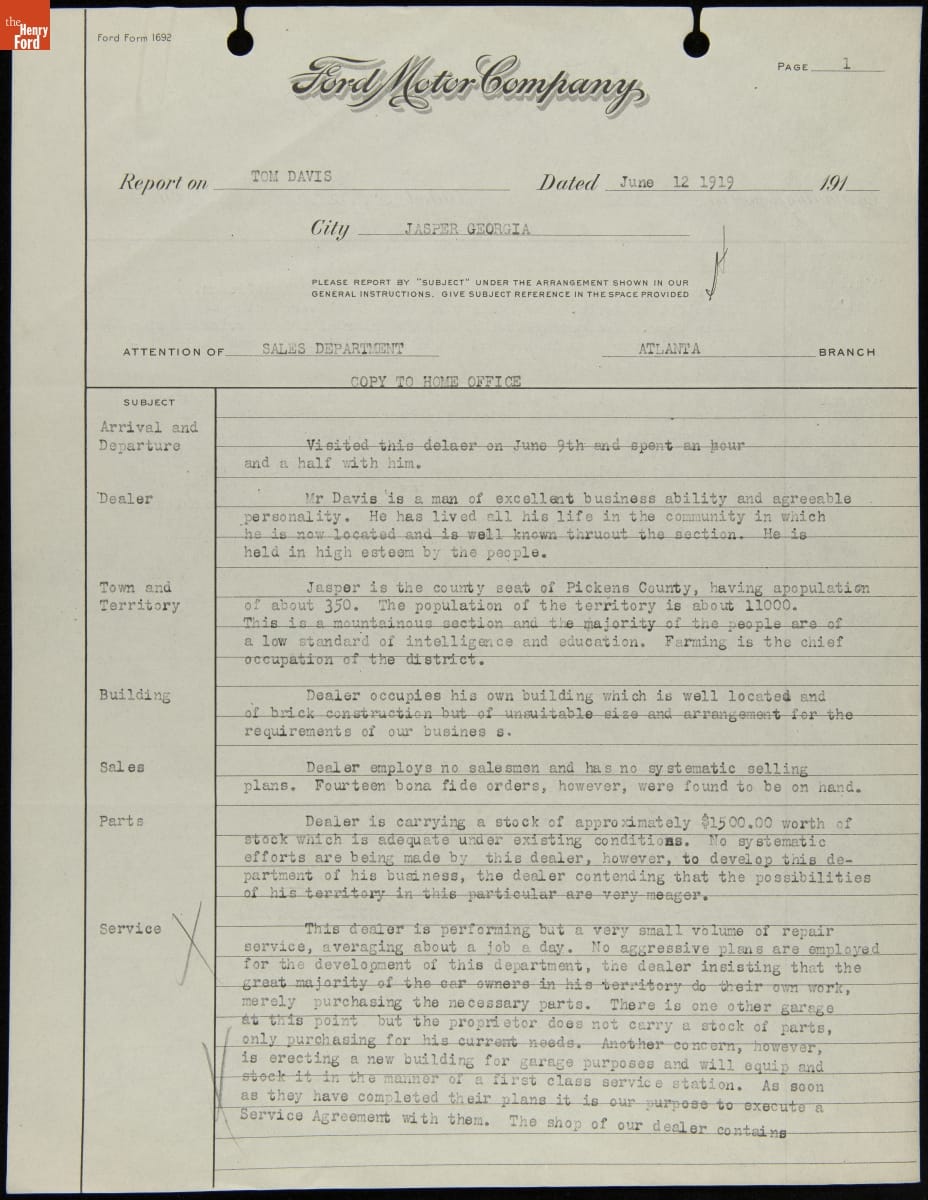 Manager Report on Tom Davis, Jasper, Georgia, June 12, 1919