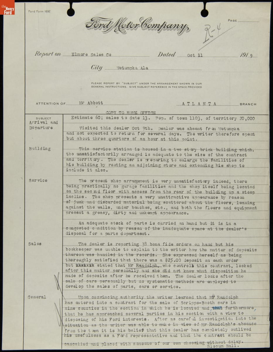 Manager Report Recommending the Cancellation of Elmore Sales Company Contract, Wetumpka, Alabama, October 11, 1919