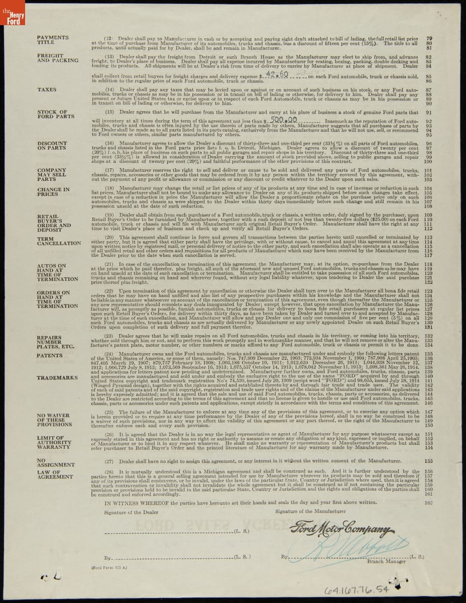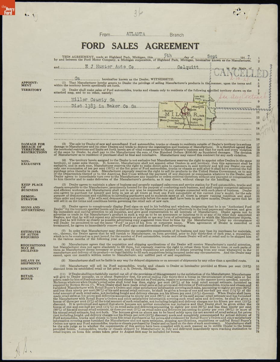 Cancelled Ford Sales Agreement for E.J. Hunter Auto Company, Colquitt, Georgia, February 10, 1921