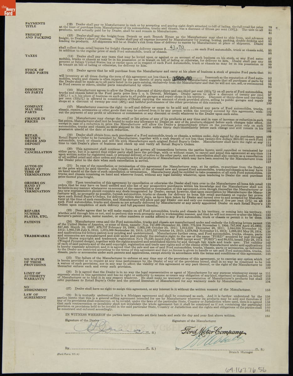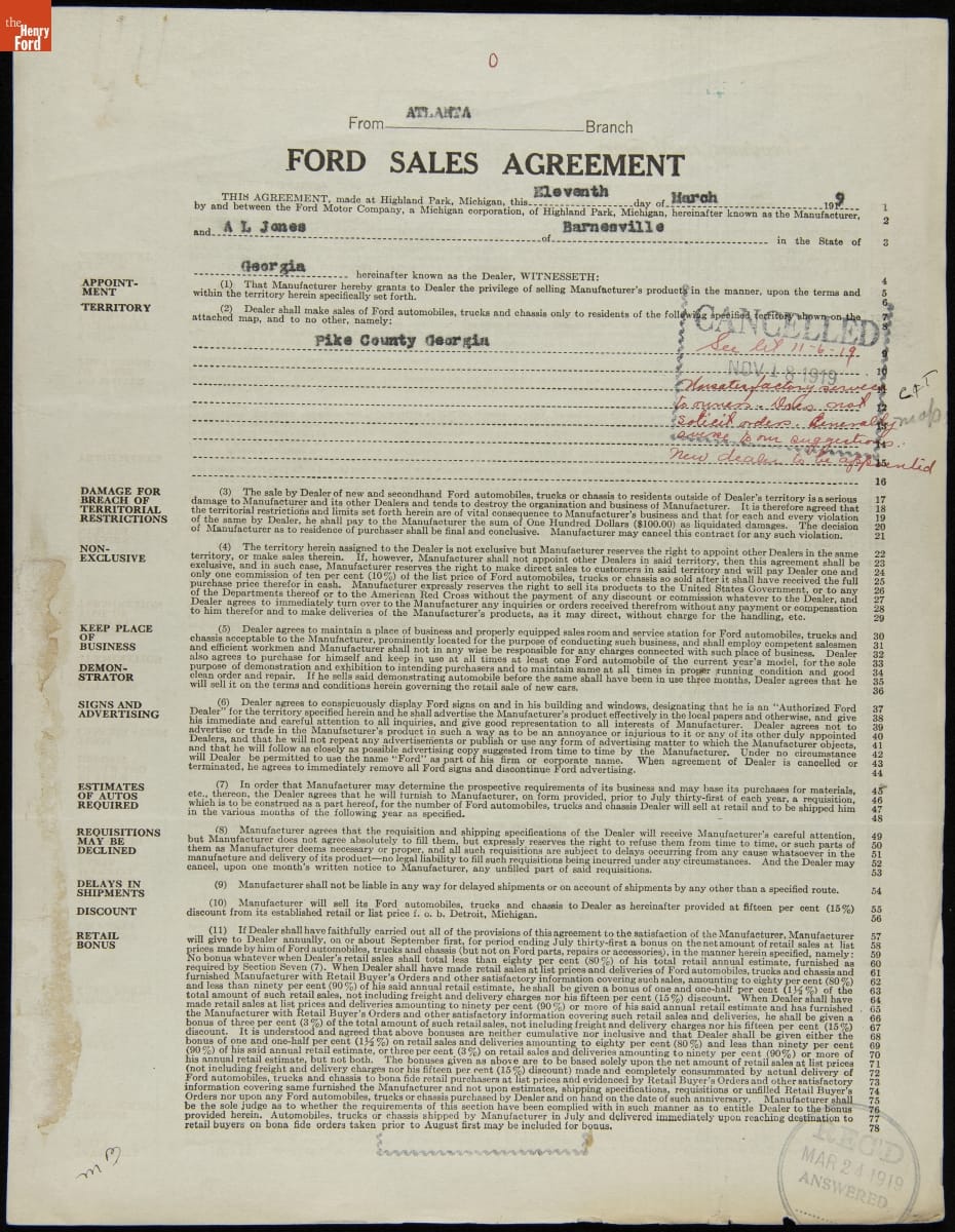 Cancelled Ford Sales Agreement for A.L. Jones, Barnesville, Georgia, November 6, 1919