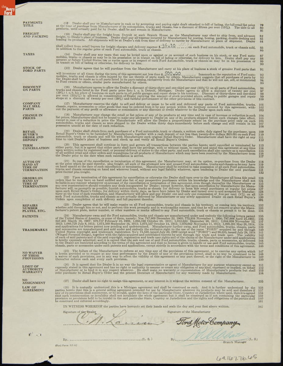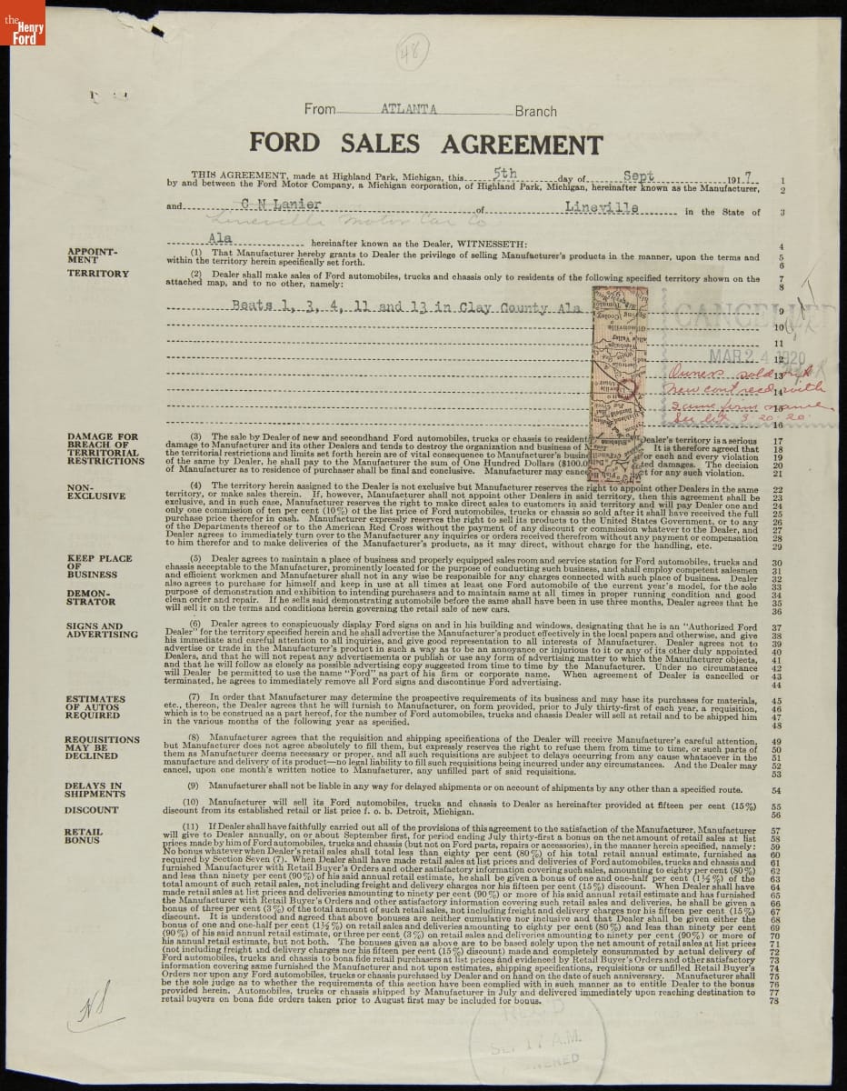 Cancelled Ford Sales Agreement for Lineville Motor Car Company, Lineville, Alabama, March 24, 1920