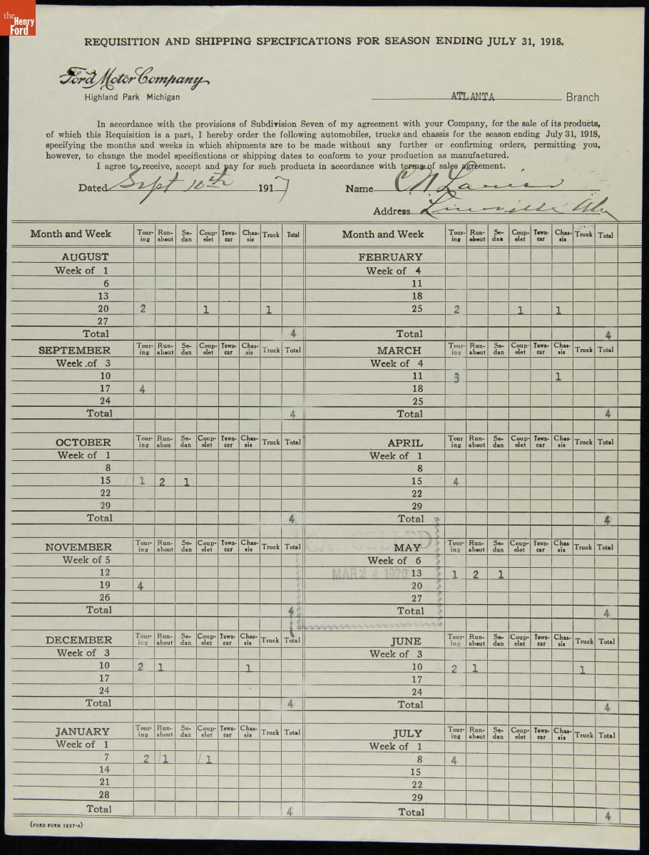 Cancelled Requisition Form for Lineville Motor Car Company, Lineville, Alabama, March 24, 1920