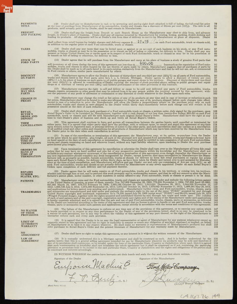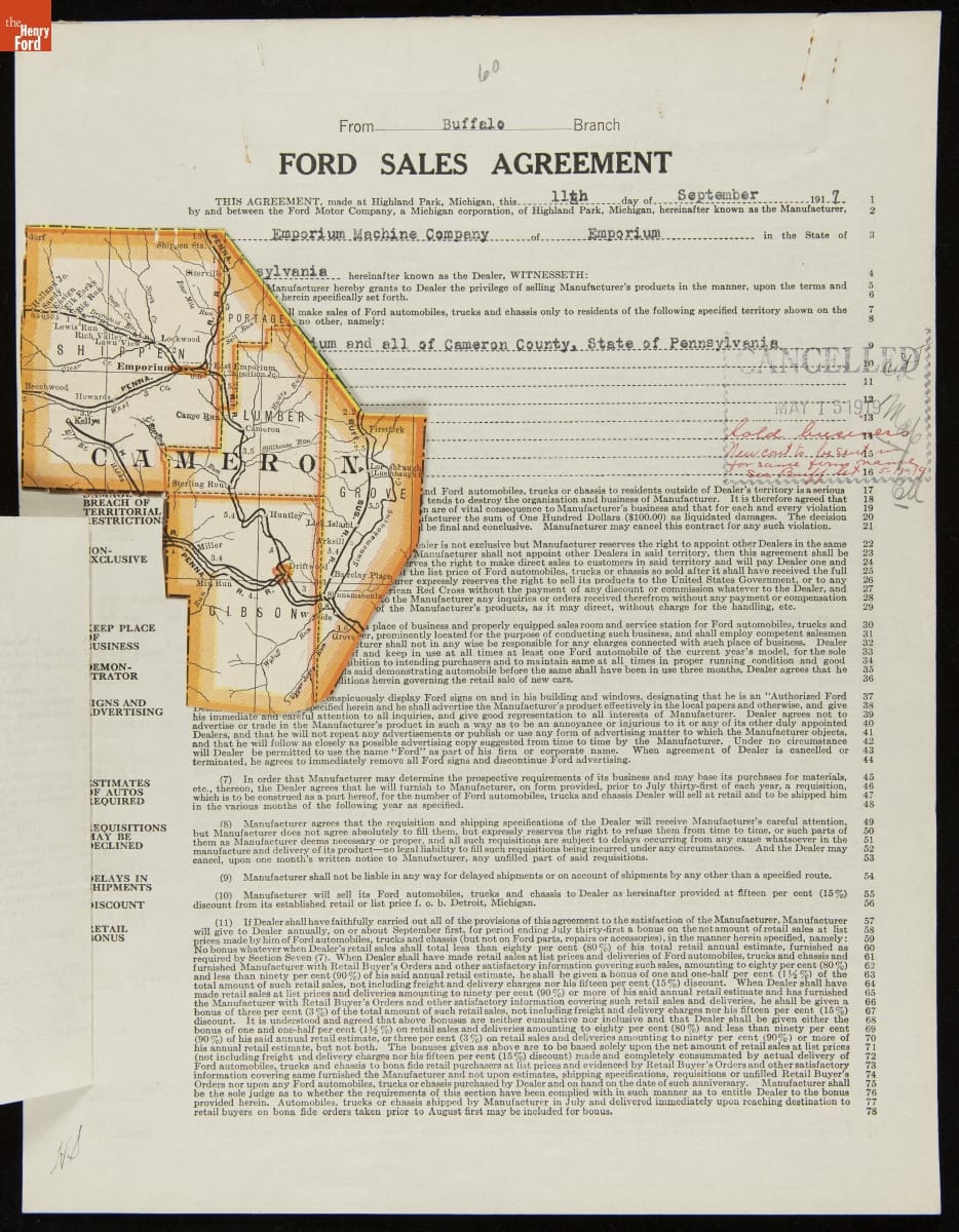 Cancelled Ford Sales Agreement for Emporium Machine Company, Emporium, Pennsylvania, May 15, 1919
