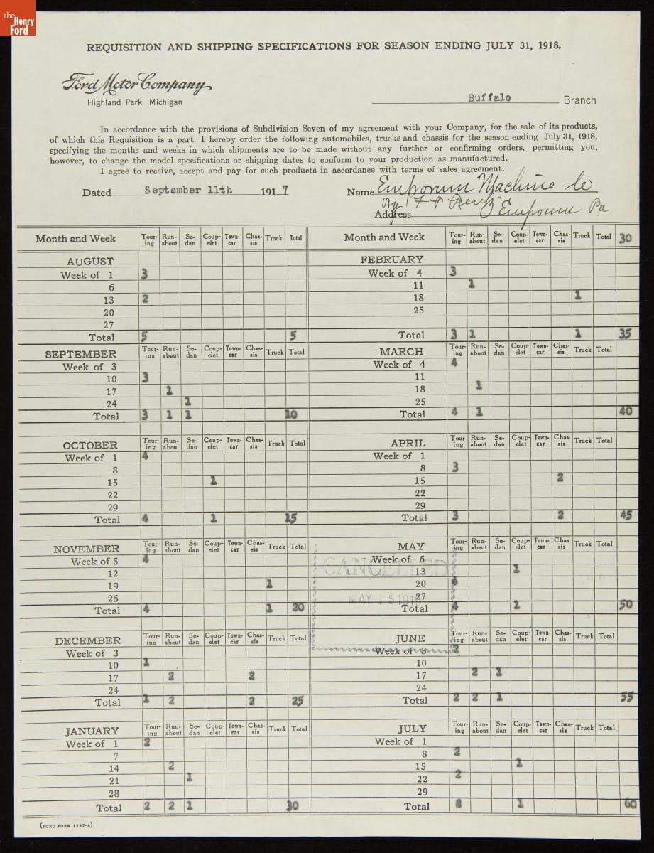 Cancelled Requisition Form for Emporium Machine Company, Emporium, Pennsylvania, May 15, 1919