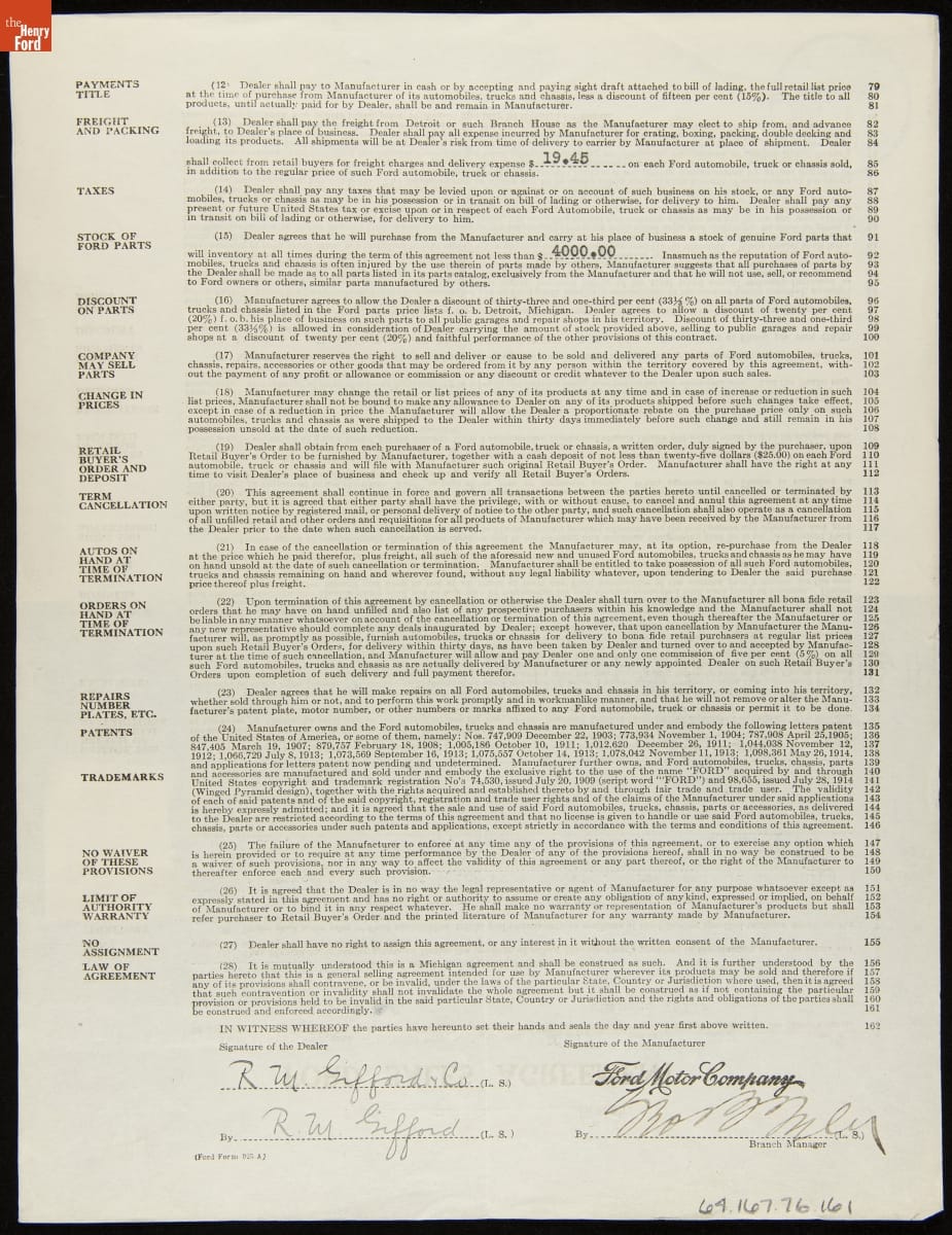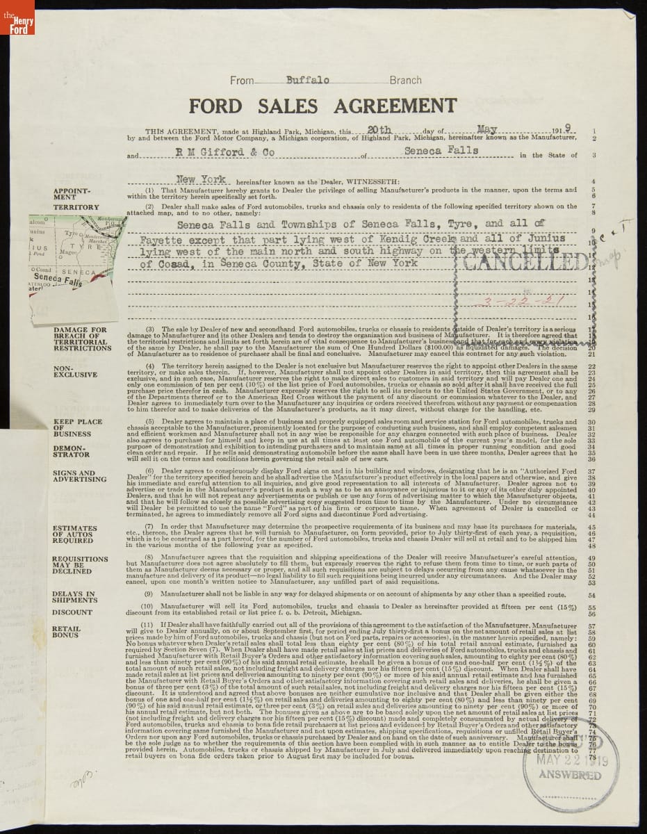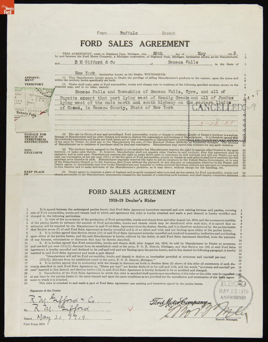 Cancelled Ford Sales Agreement for R.M. Gifford and Company, Seneca Falls, New York, March 22, 1921