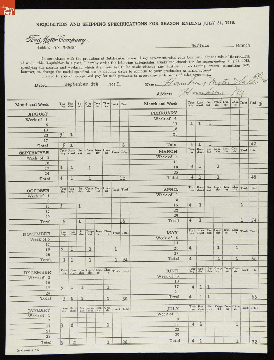 Requisition Form for Hamburg Motor Sales Company, Hamburg, New York, September 1918