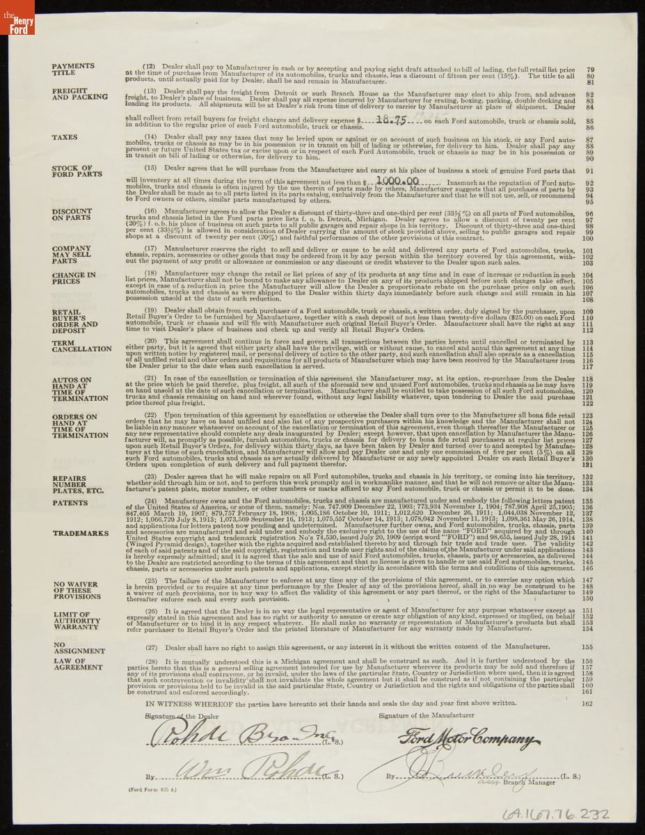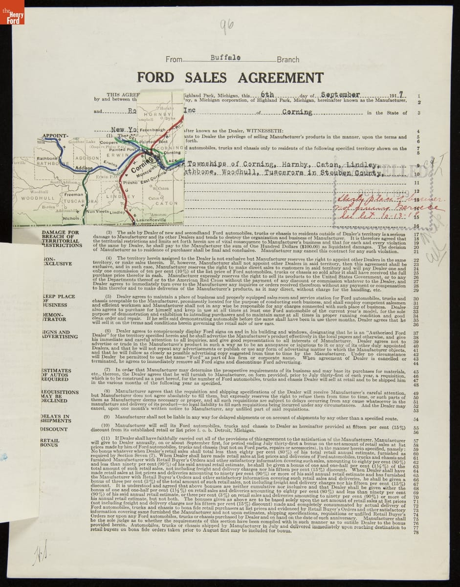 Cancelled Ford Sales Agreement for Rohde Bros. Inc., Corning, New York, October 17, 1919