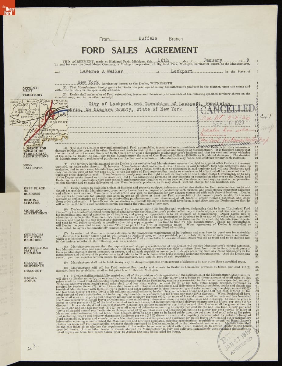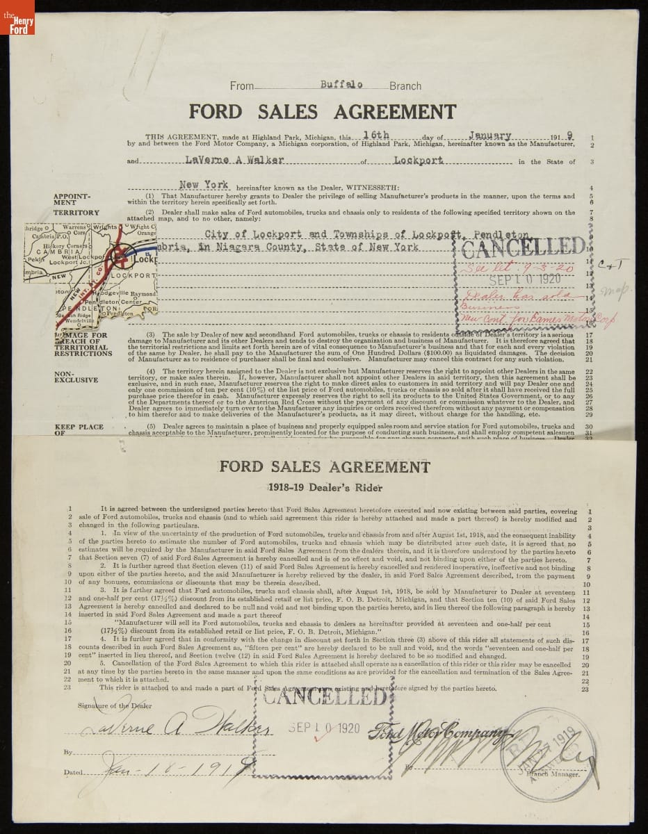 Cancelled Ford Sales Agreement for LaVerne A. Walker, Lockport, New York, September 10, 1920