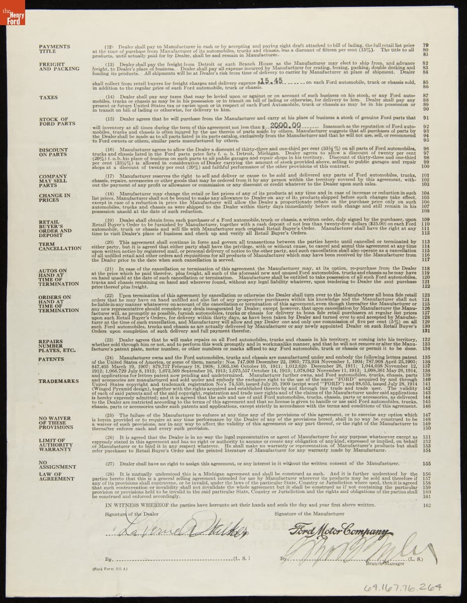 Though it operated some direct-sales offices in major cities, Ford Motor Company sold most of its Model T cars through franchise agreements with independent dealers. Each franchisee received the right to sell Ford cars within a specific territory. Ford encouraged dealers by offering discounts and rebates to high sellers. But low-selling dealers risked losing their territories.