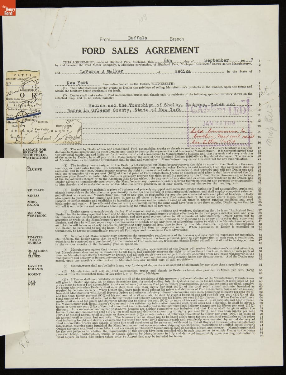 Cancelled Ford Sales Agreement for LaVerne A. Walker, Medina, New York, January 29, 1919