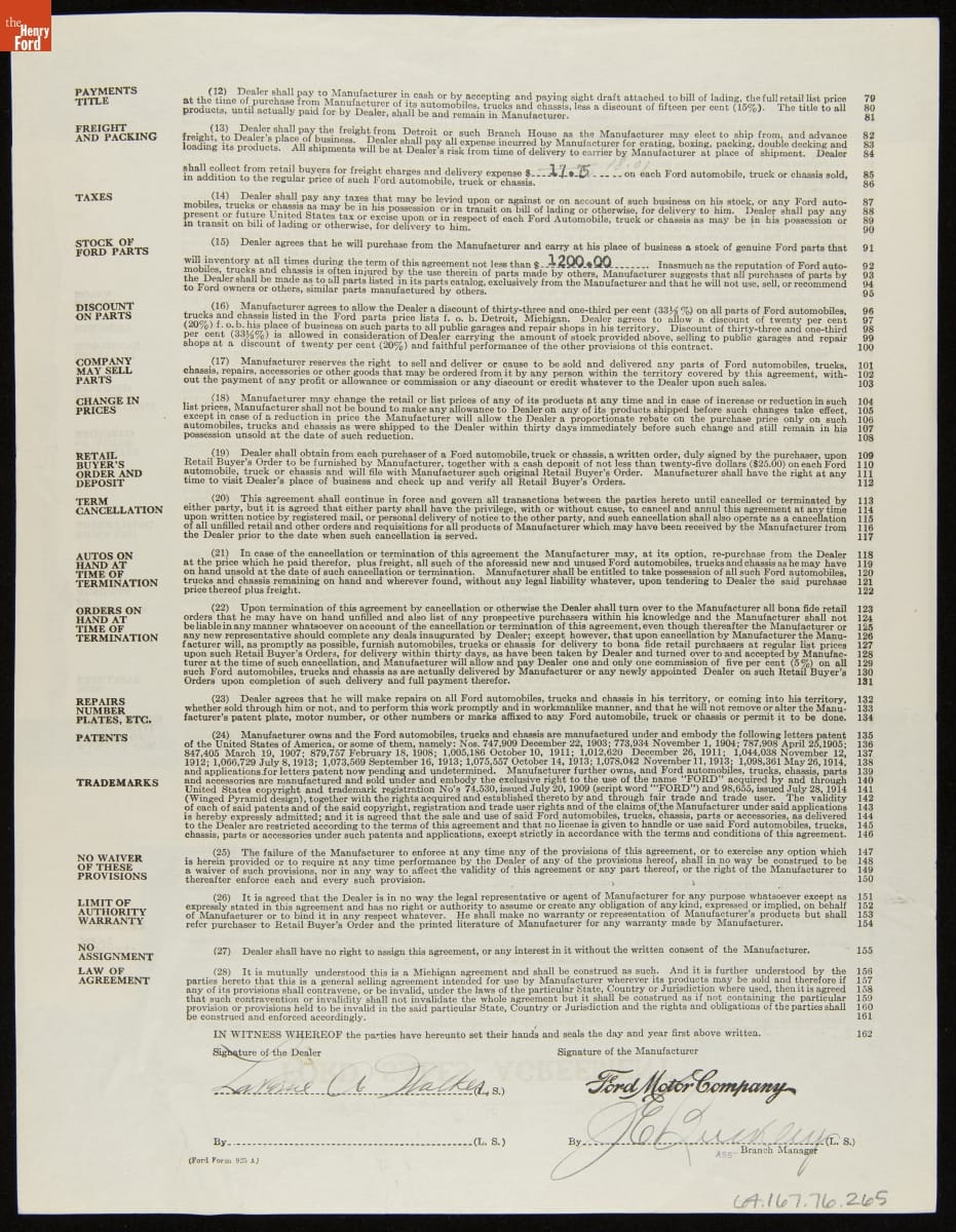 Though it operated some direct-sales offices in major cities, Ford Motor Company sold most of its Model T cars through franchise agreements with independent dealers. Each franchisee received the right to sell Ford cars within a specific territory. Ford encouraged dealers by offering discounts and rebates to high sellers. But low-selling dealers risked losing their territories.