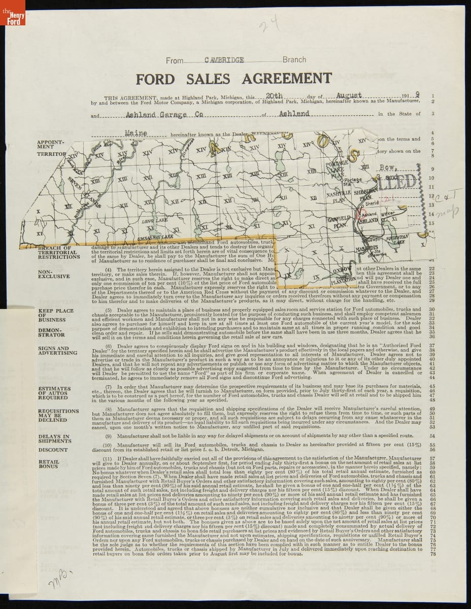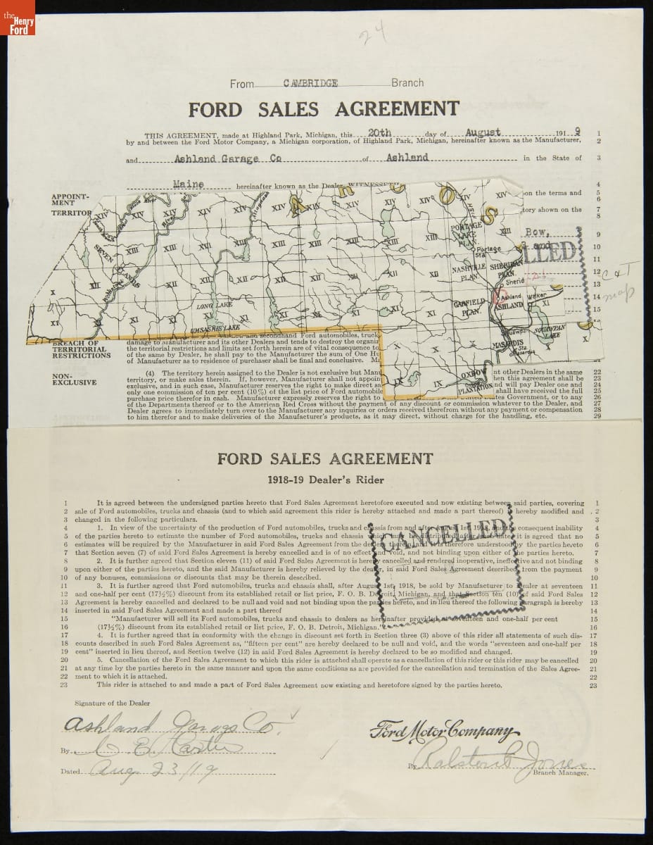 Cancelled Ford Sales Agreement for Ashland Garage Co., Ashland, Maine, 1921
