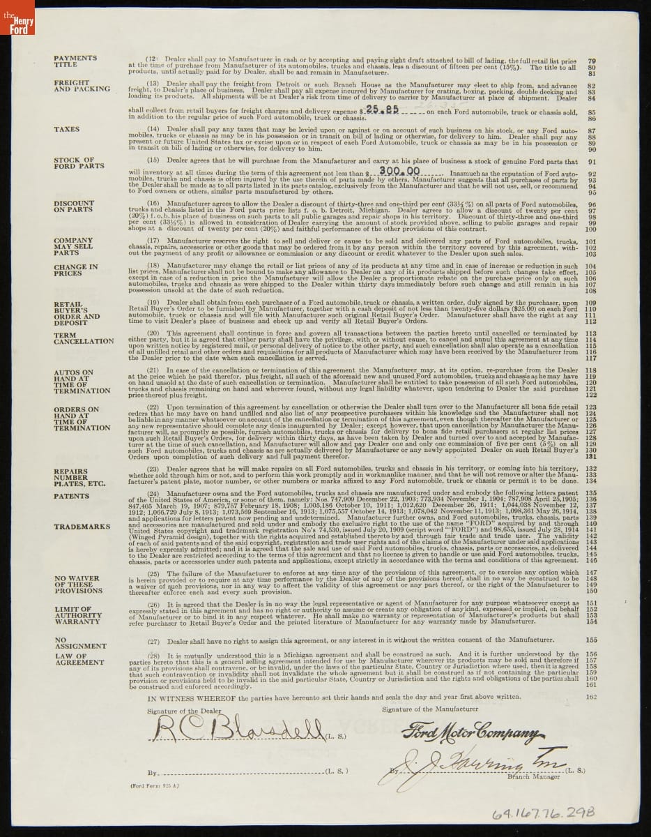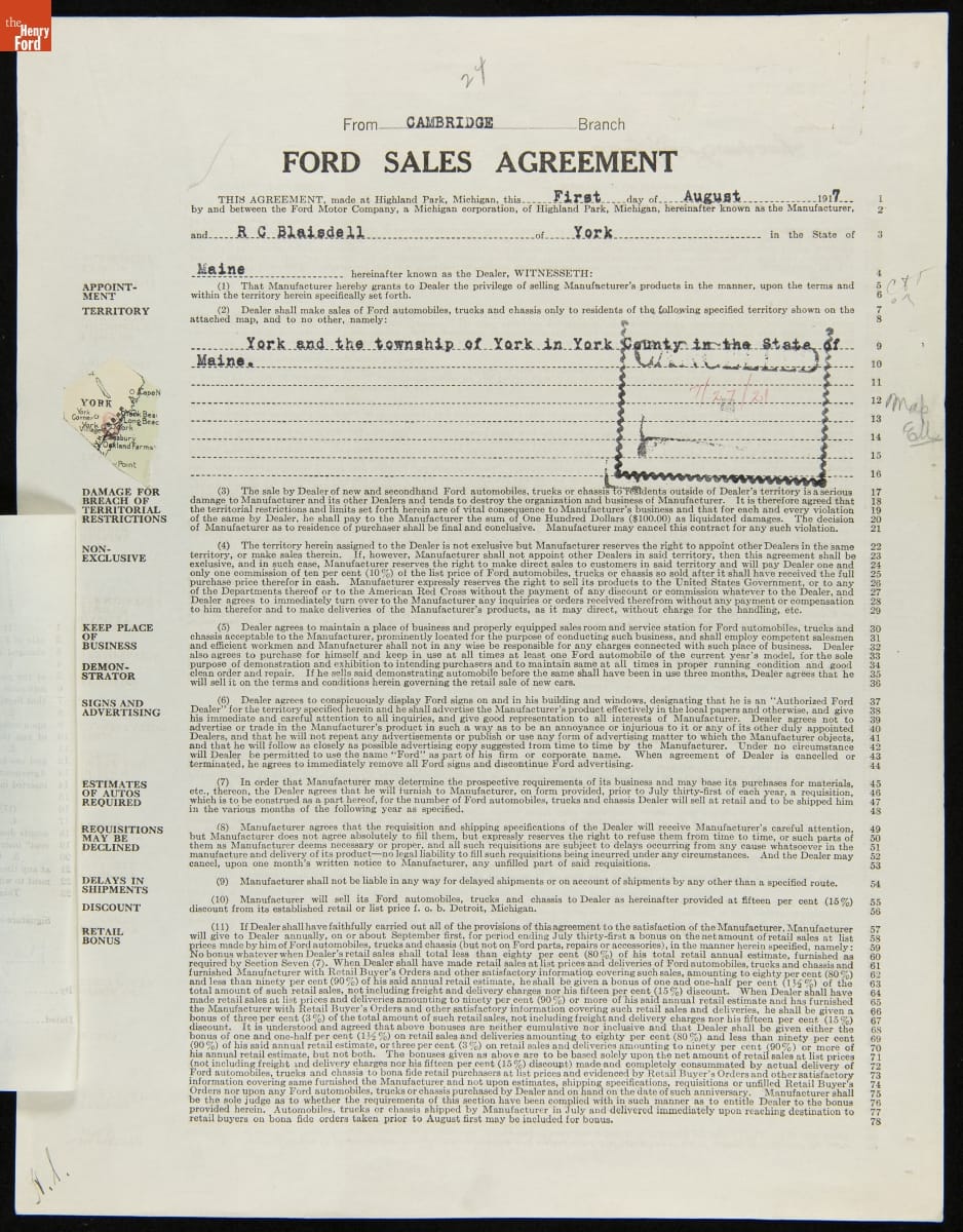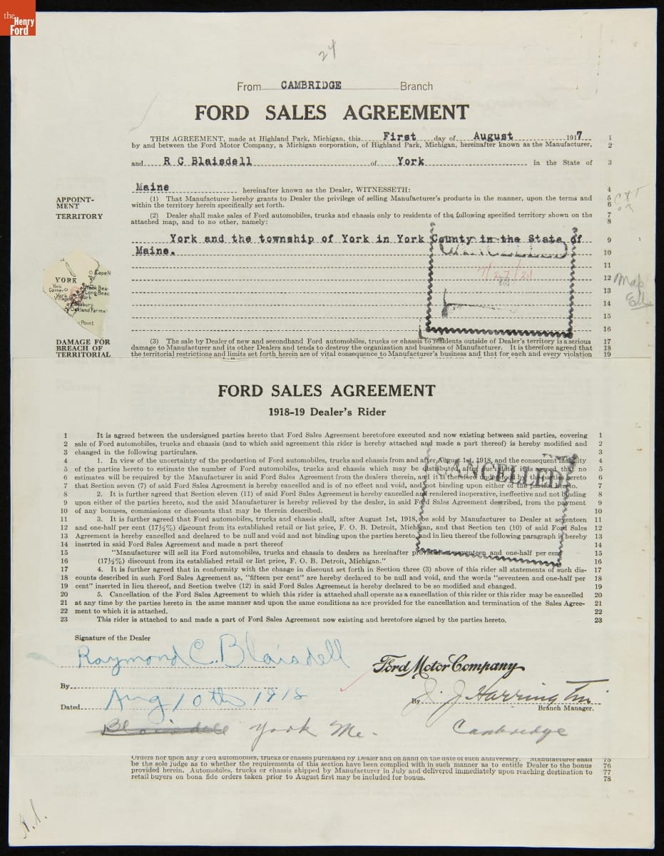 Cancelled Ford Sales Agreement for R.C. Blaisdell, York, Maine, July 27, 1921