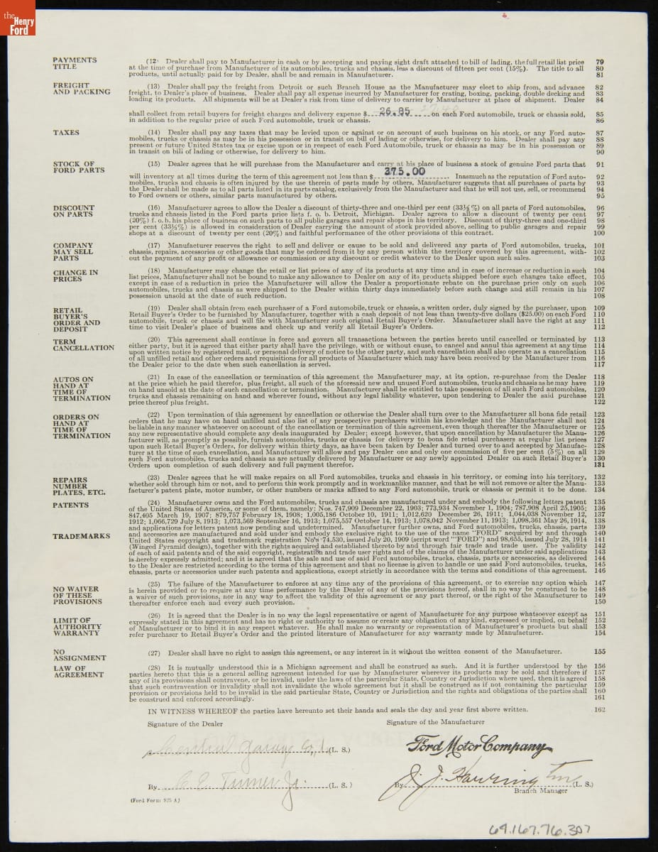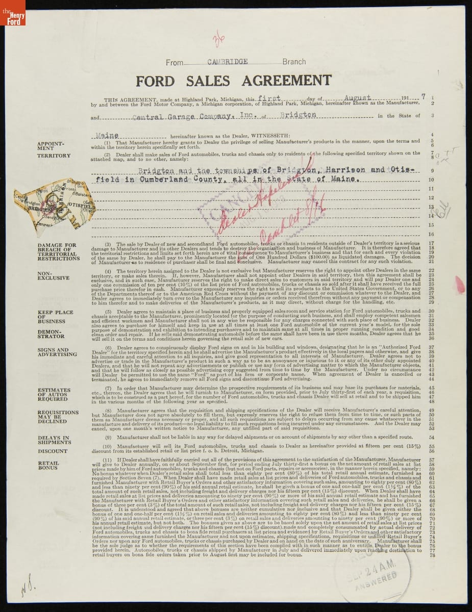 Cancelled Ford Sales Agreement for Central Garage Company, Inc., Bridgton, Maine, August 16, 1918