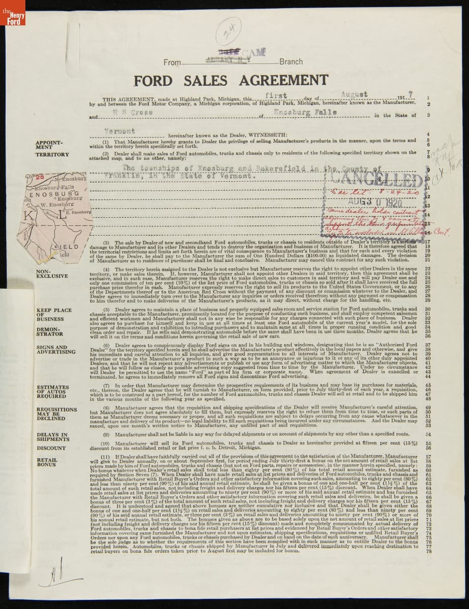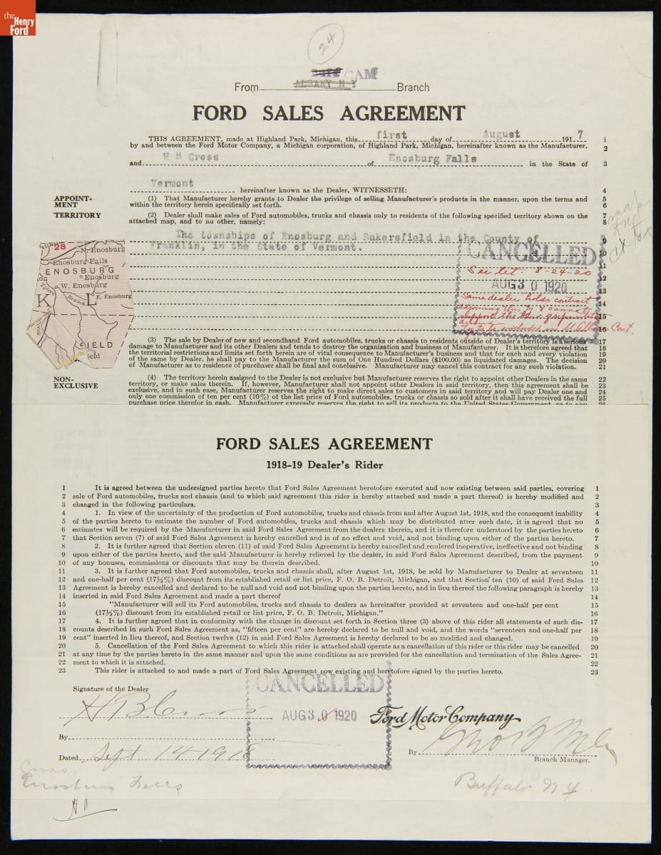 Cancelled Ford Sales Agreement for H.H. Cross, Enosburg Falls, Vermont, August 30, 1920