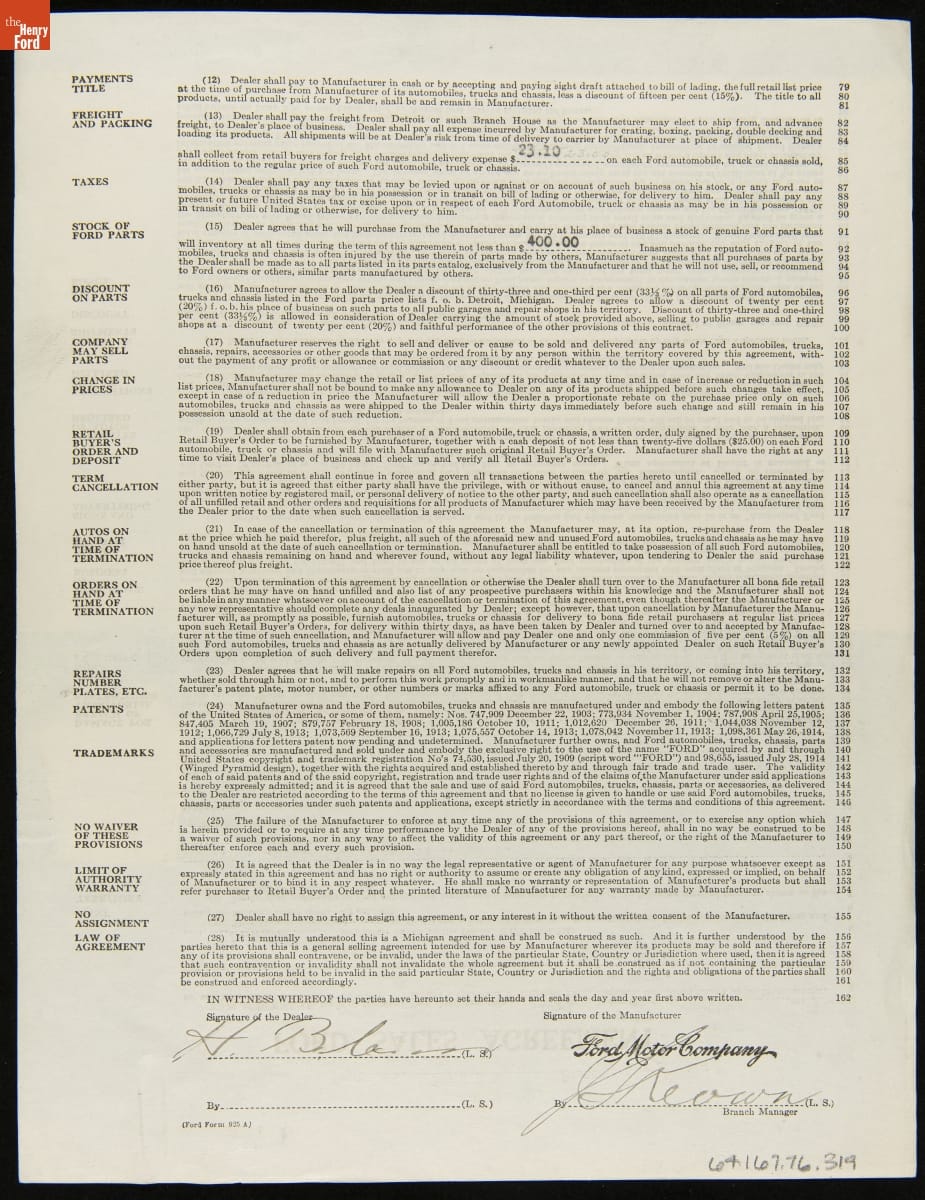 Though it operated some direct-sales offices in major cities, Ford Motor Company sold most of its Model T cars through franchise agreements with independent dealers. Each franchisee received the right to sell Ford cars within a specific territory. Ford encouraged dealers by offering discounts and rebates to high sellers. But low-selling dealers risked losing their territories.