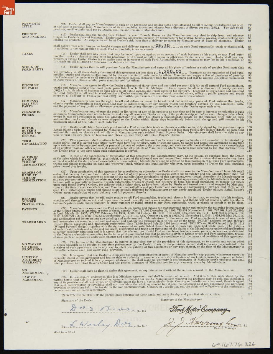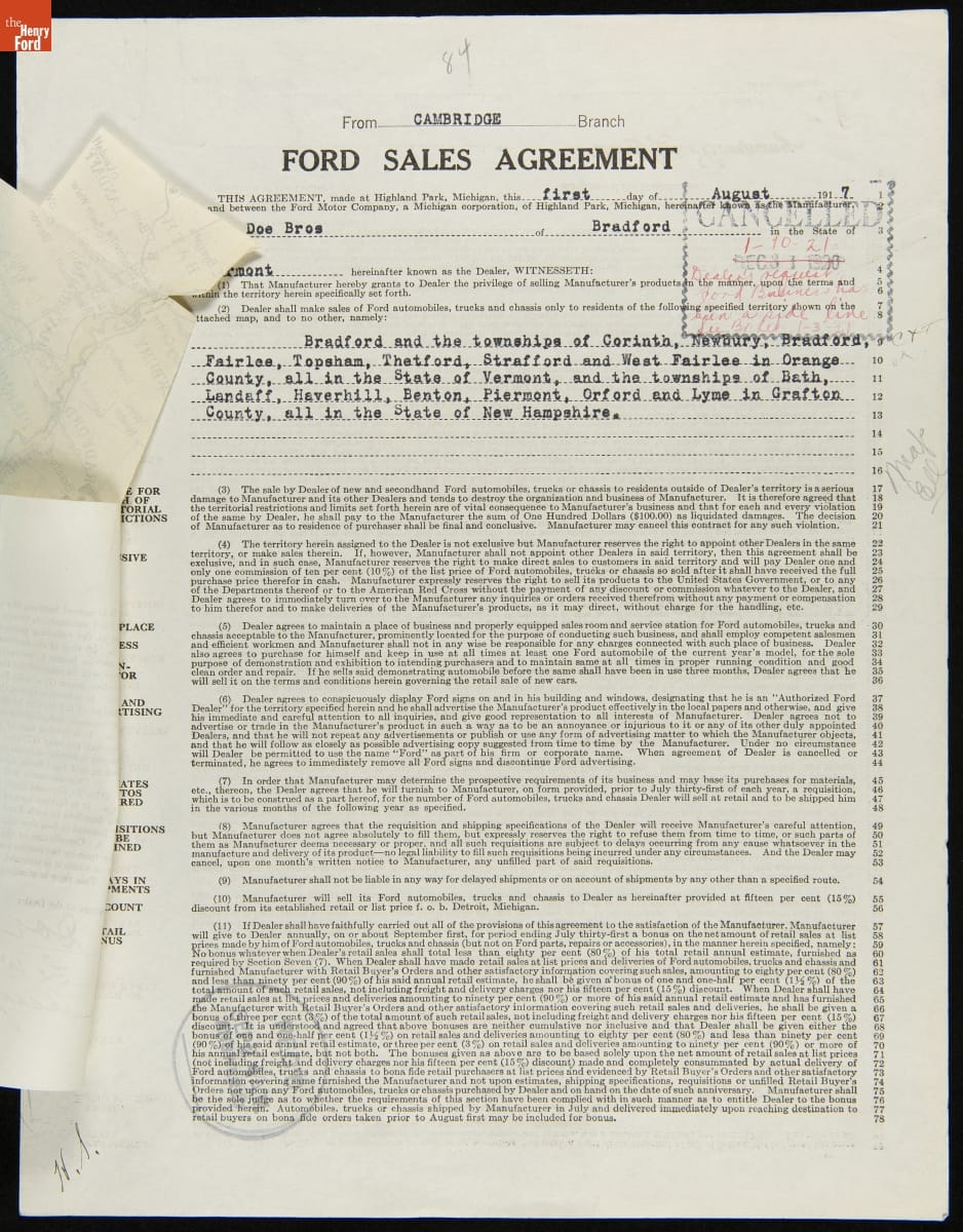 Cancelled Ford Sales Agreement for Doe Bros., Bradford, Vermont, January 10, 1921