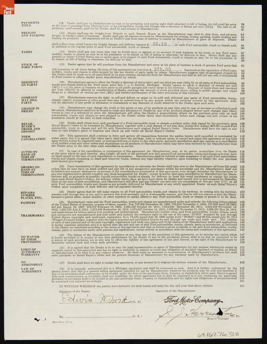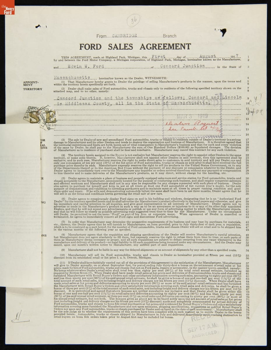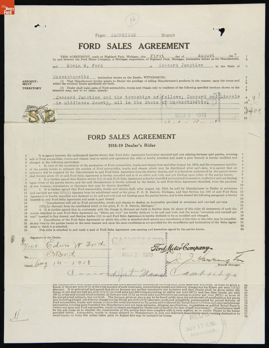 Cancelled Ford Sales Agreement for Edwin W. Ford, Concord Junction, Massachusetts, March 3, 1919