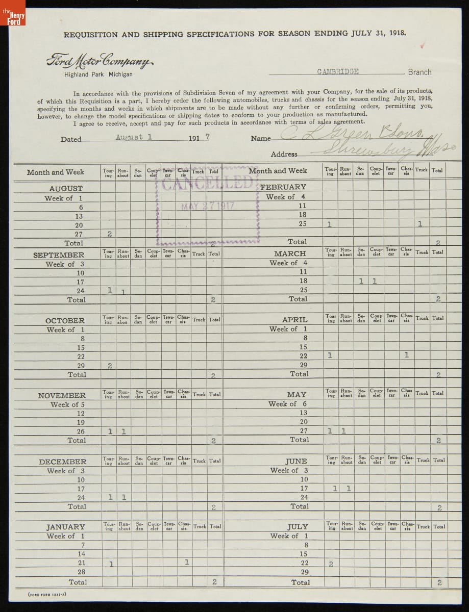 Cancelled Requisition Form for C.L. Green & Sons, Shrewsbury, Massachusetts, August 1, 1917