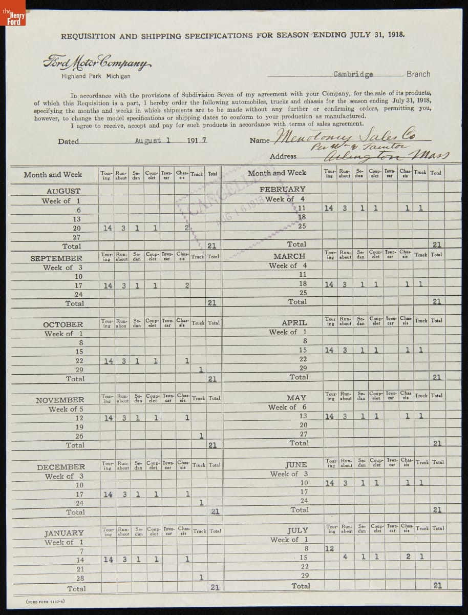 Cancelled Requisition Form for Menotomy Sales Co., Arlington, Massachusetts, August 16, 1918