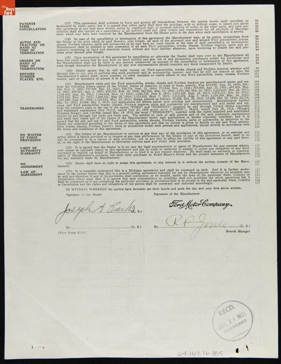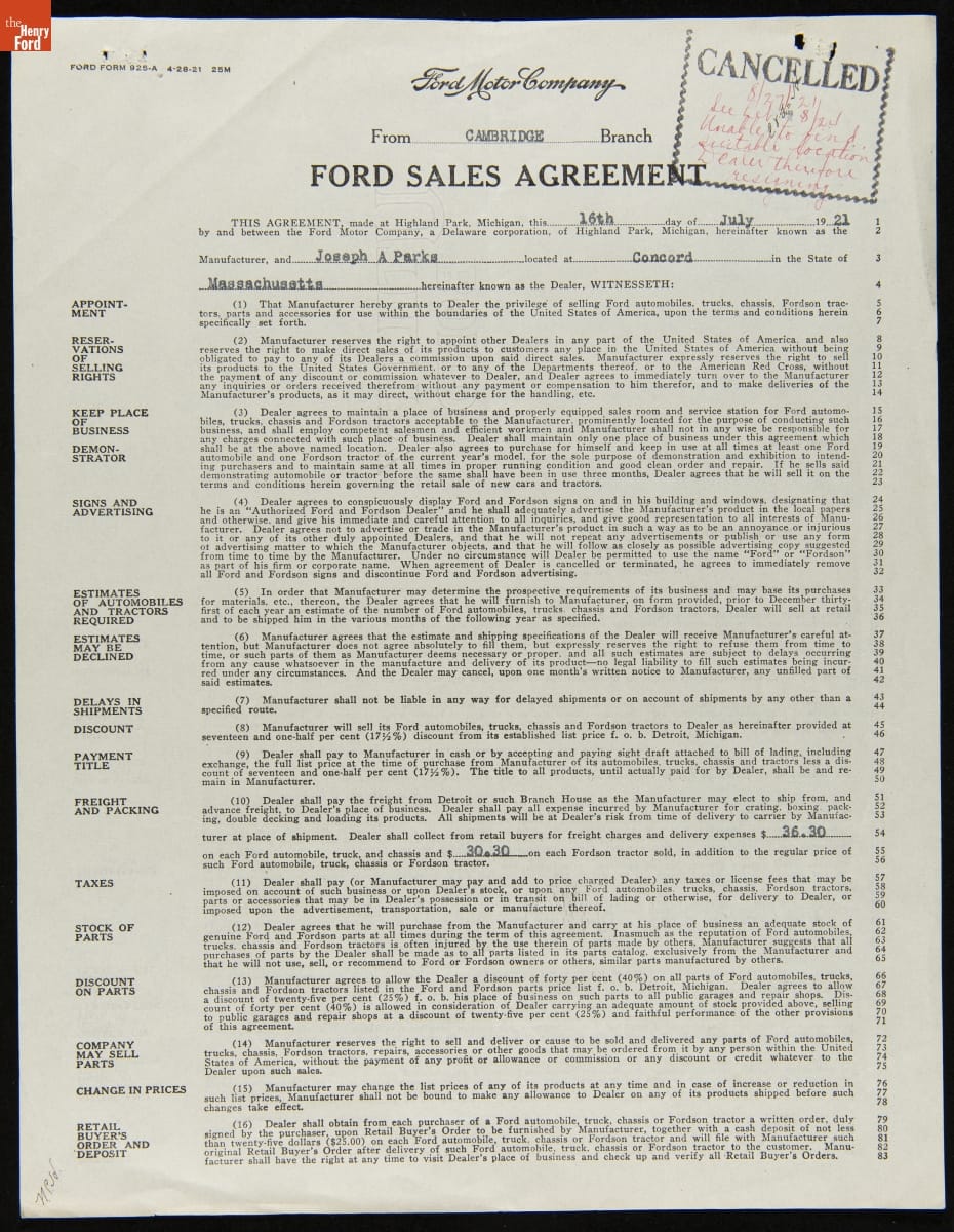 Cancelled Ford Sales Agreement for Joseph A. Parks, Concord, Massachusetts, August 27, 1921