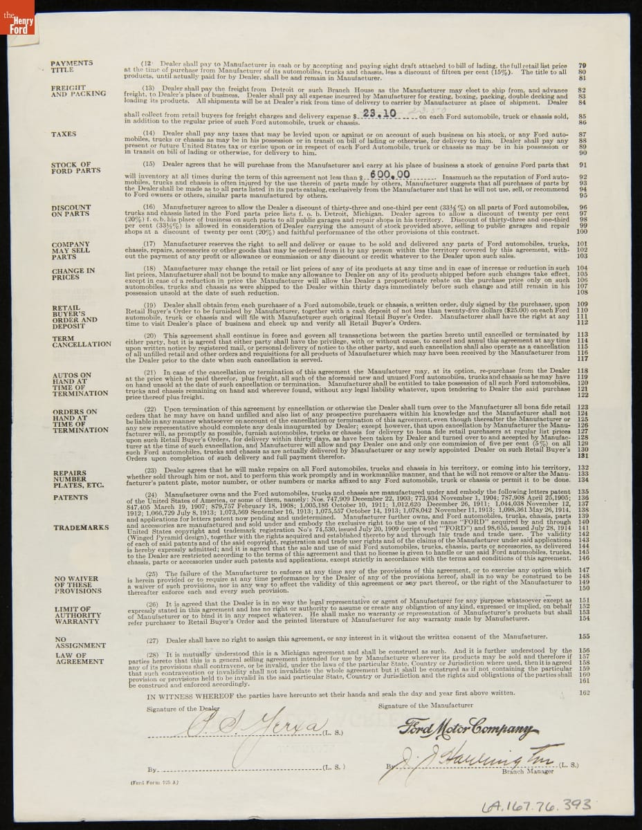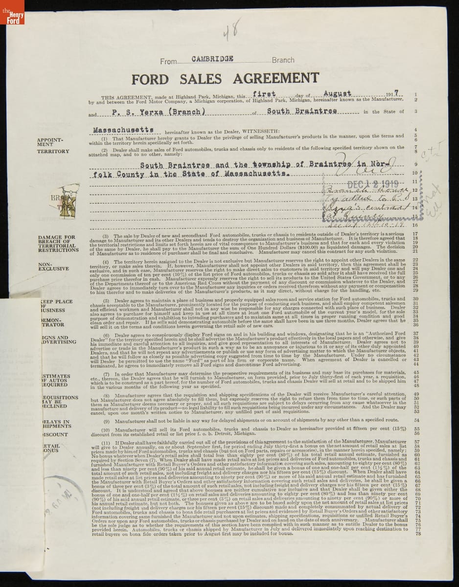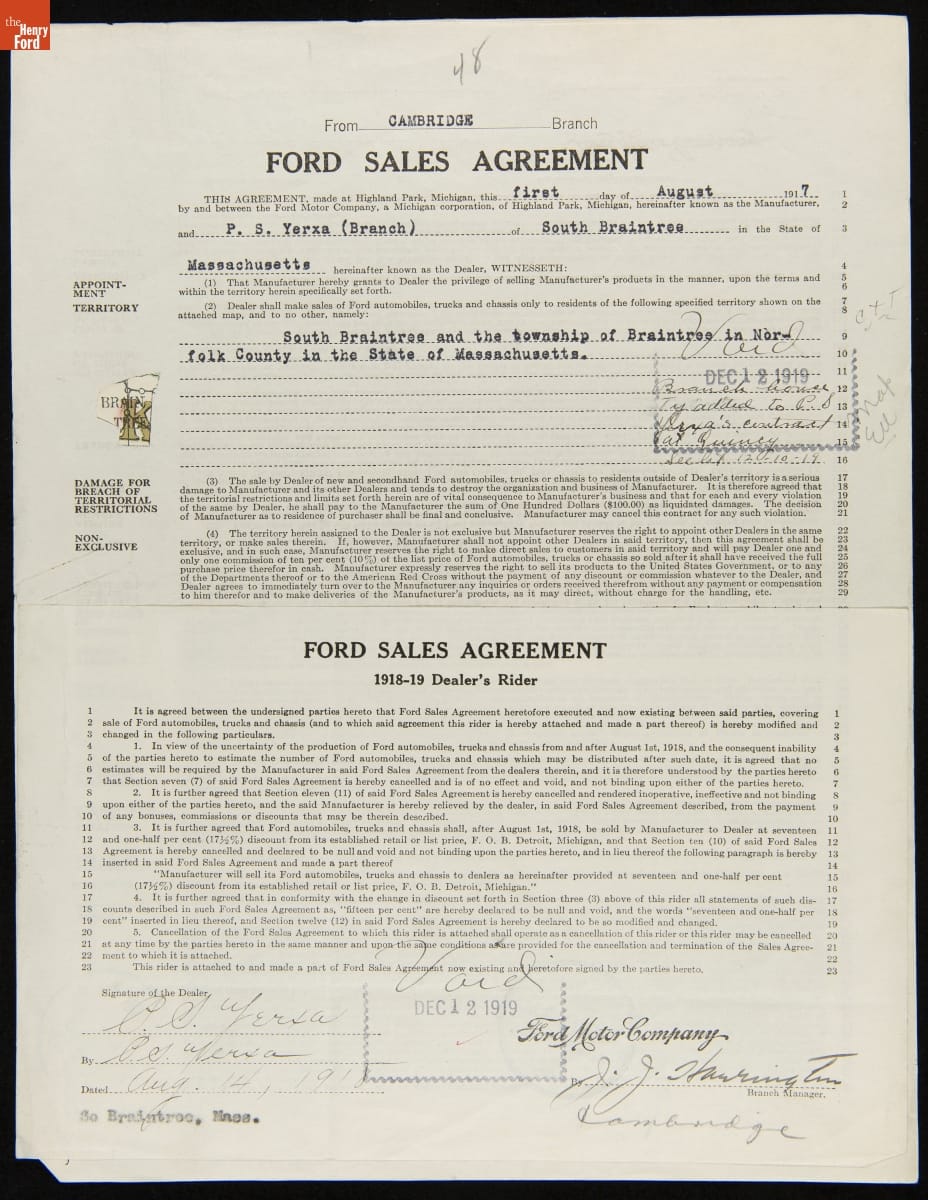 Cancelled Ford Sales Agreement for P.S. Yerxa (Branch), South Braintree, Massachusetts, December 12, 1919