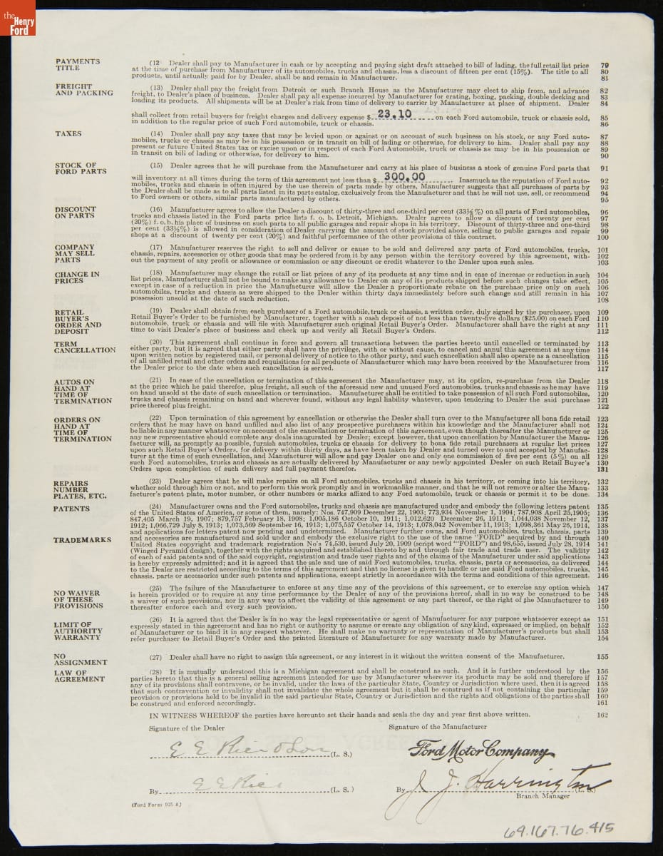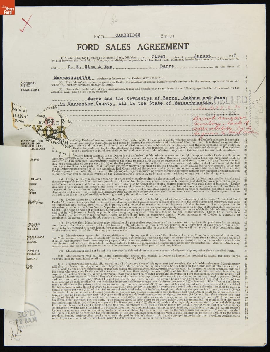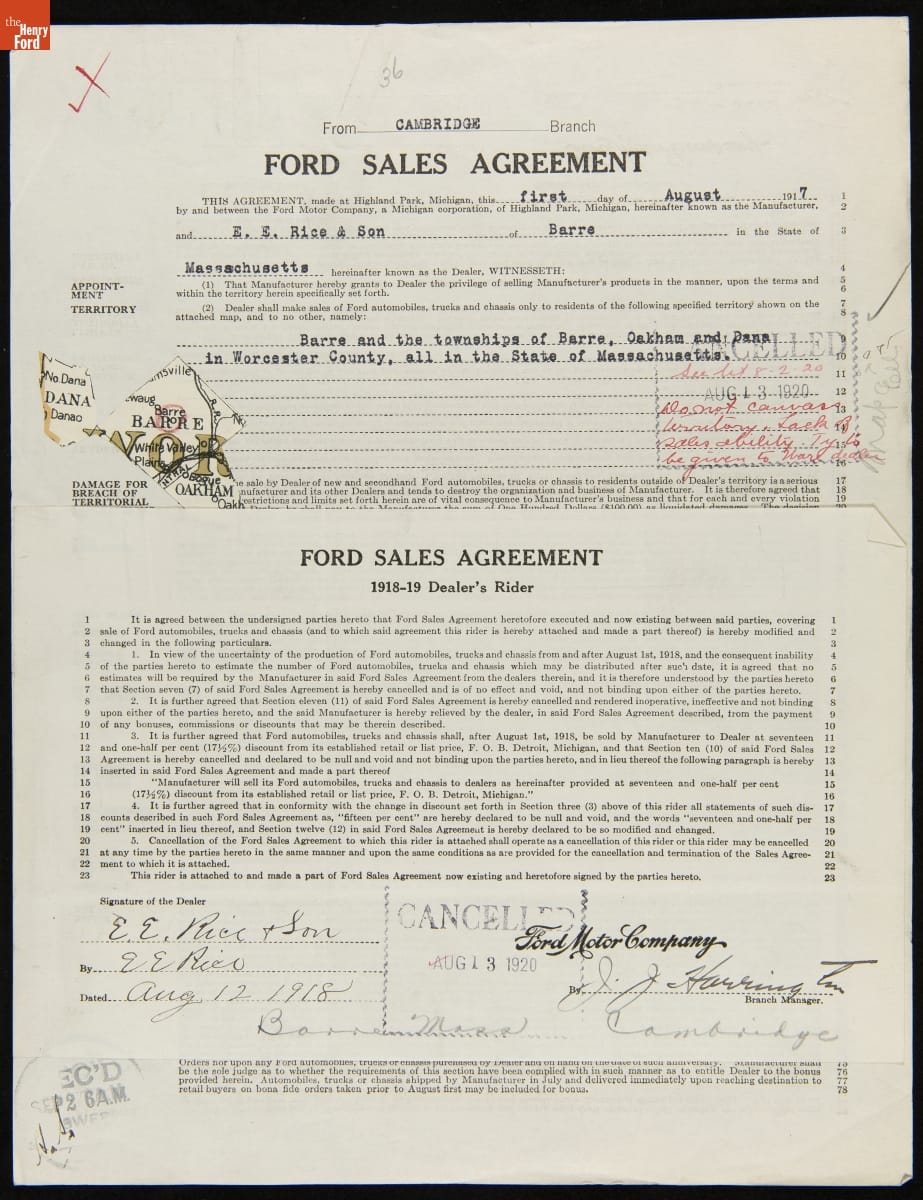 Cancelled Ford Sales Agreement for E.E. Rice & Son, Barre, Massachusetts, August 13, 1920