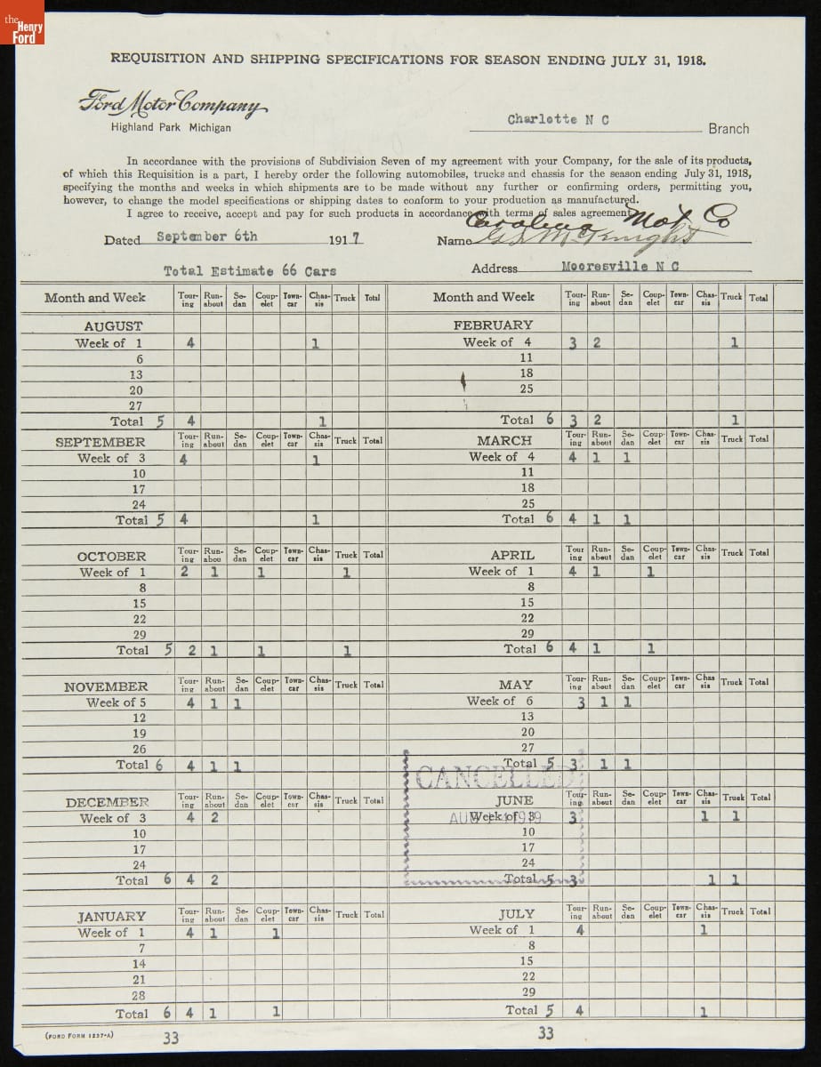 Ford Model T Requisition Form for Carolina Motor Company, Mooresville, North Carolina, August 1917-July 1918