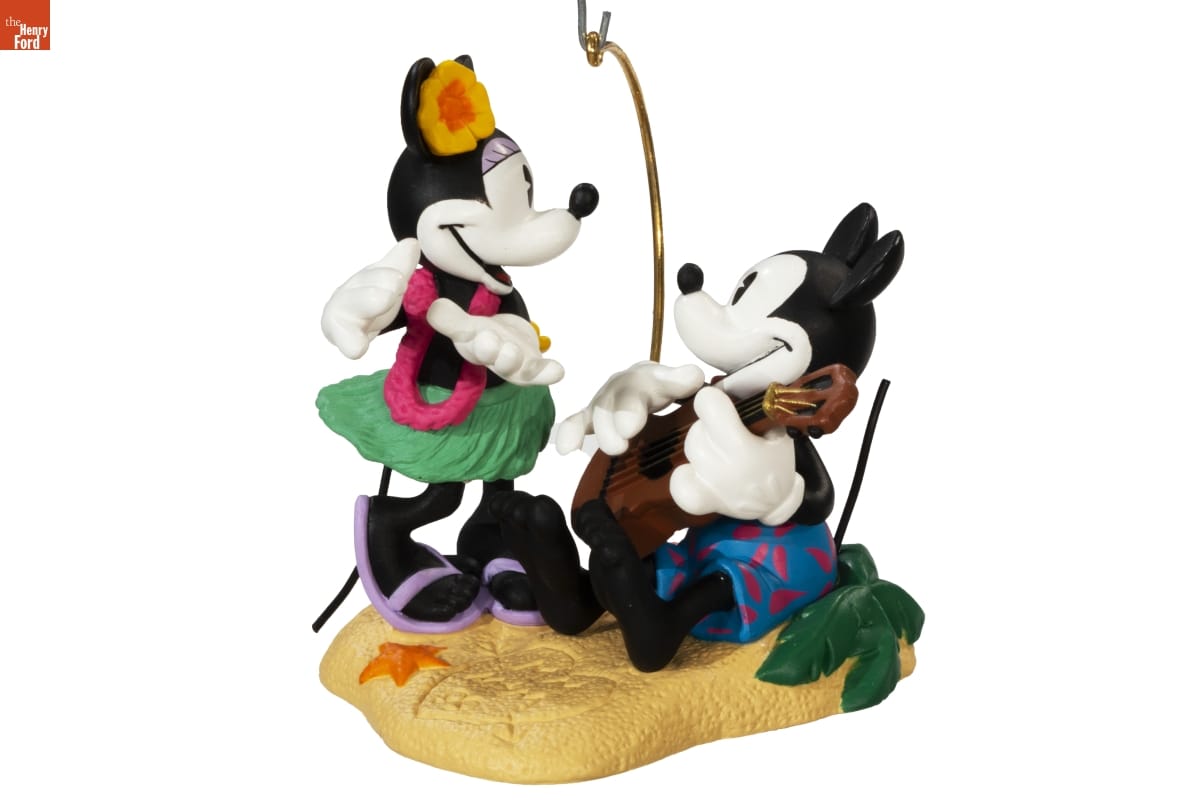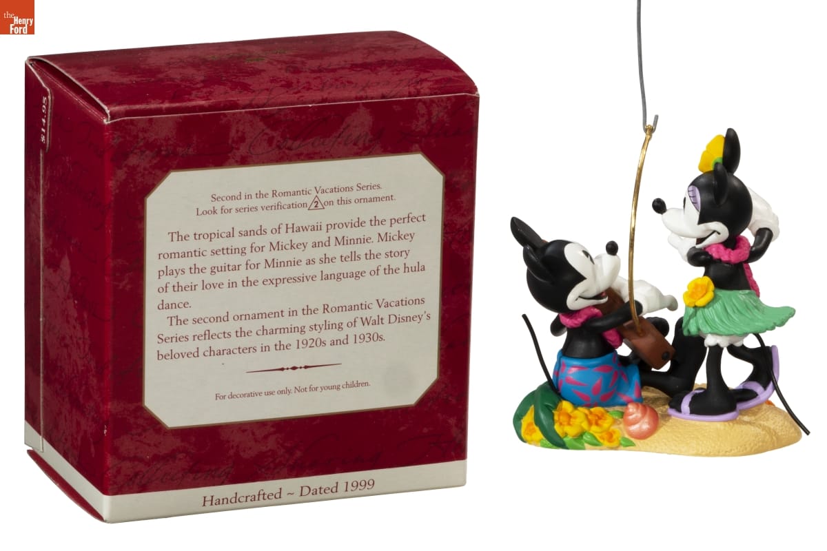 Second in the Romantic Vacations Series. / Look for series verification 2 on this ornament. / The tropical sands of Hawaii provide the perfect / romantic setting for Mickey and Minnie. Mickey / plays the guitar for Minnie as she tells the story / of their love in the expressive language of the hula / dance. / The second ornament in the Romantic Vacations / Series reflects the charming styling of Walt Disney's / beloved characters in the 1920s and 1930s / For decorative use only. Not for young children. / Handcrafted - Dated 1999