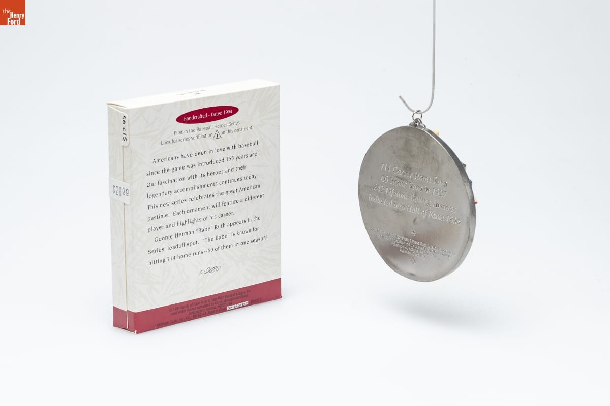 Handcrafted - Dated 1994 / First in the Baseball Heroes Series. / Look for series verification 1 on this ornament. / Americans have been in love with baseball / since the game was introduced 155 years ago. / Our fascination with its heroes and their / legendary accomplishments continues today. / This new series celebrates the great American / pastime. Each ornament will feature a different / player and highlights of his career. / George Herman "Babe" Ruth appears in the / Series' leadoff spot. "The Babe" is known for / hitting 714 home runs--60 of them in one season! / (C) 1994 Family of Babe Ruth & Babe Ruth Baseball League, Inc. / used under license authorized by Curtis Management Group. / Indianapolis, Indiana, 46202 USA / Hallmark Cards, Inc., K.C., MO 64141 Made in China QX532-3