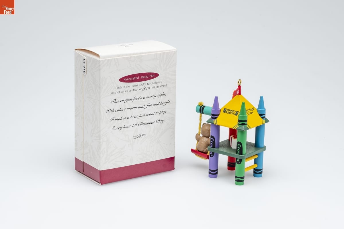 Handcrafted - Dated 1994 / Sixth in the CRAYOLA(R) Crayon Series. / Look for series verification 6 on this ornament. / This crayon fort's a merry sight, / With colors warm and fun and bright, / It makes a bear just want to play / Every hour till christmas Day!