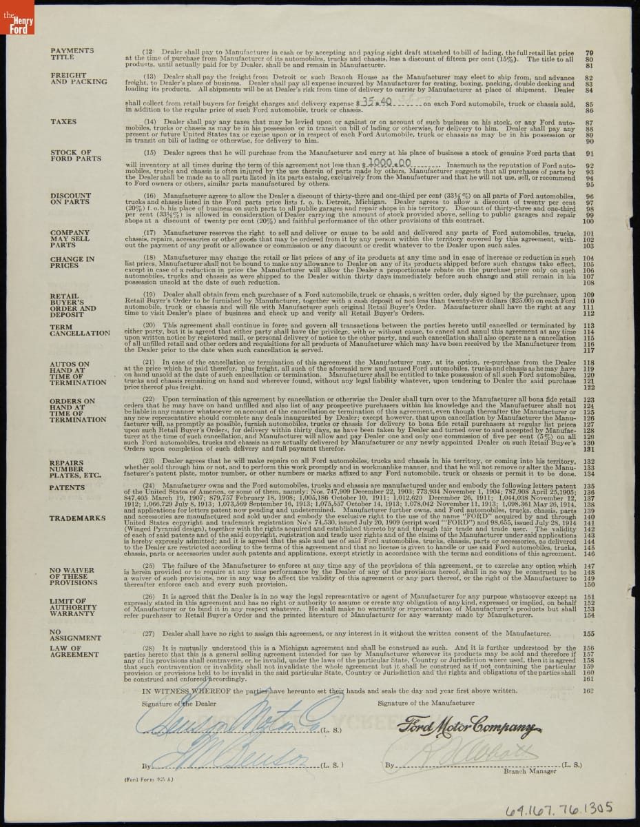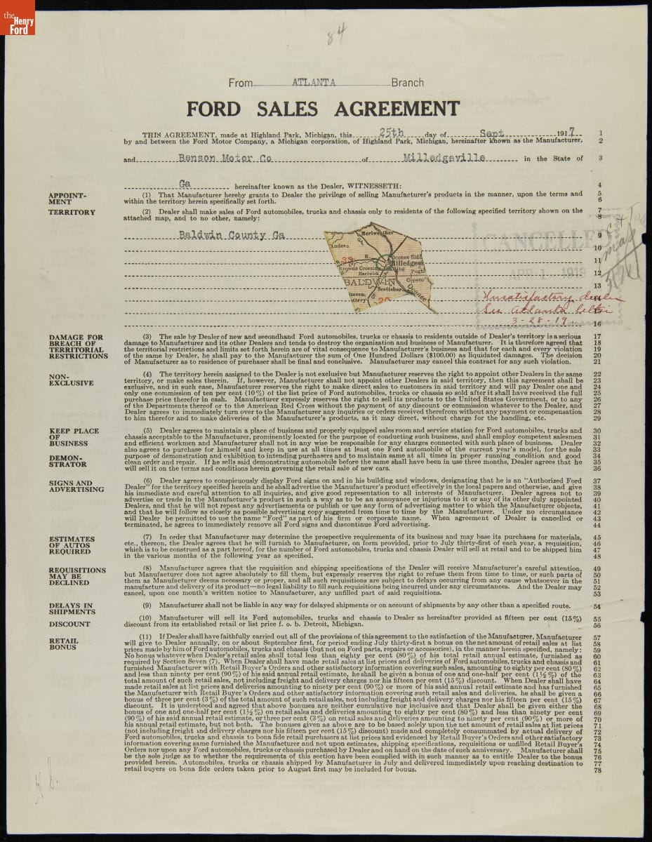 Cancelled Ford Sales Agreement for Benson Motor Company, Milledgeville, Georgia, April 1, 1919