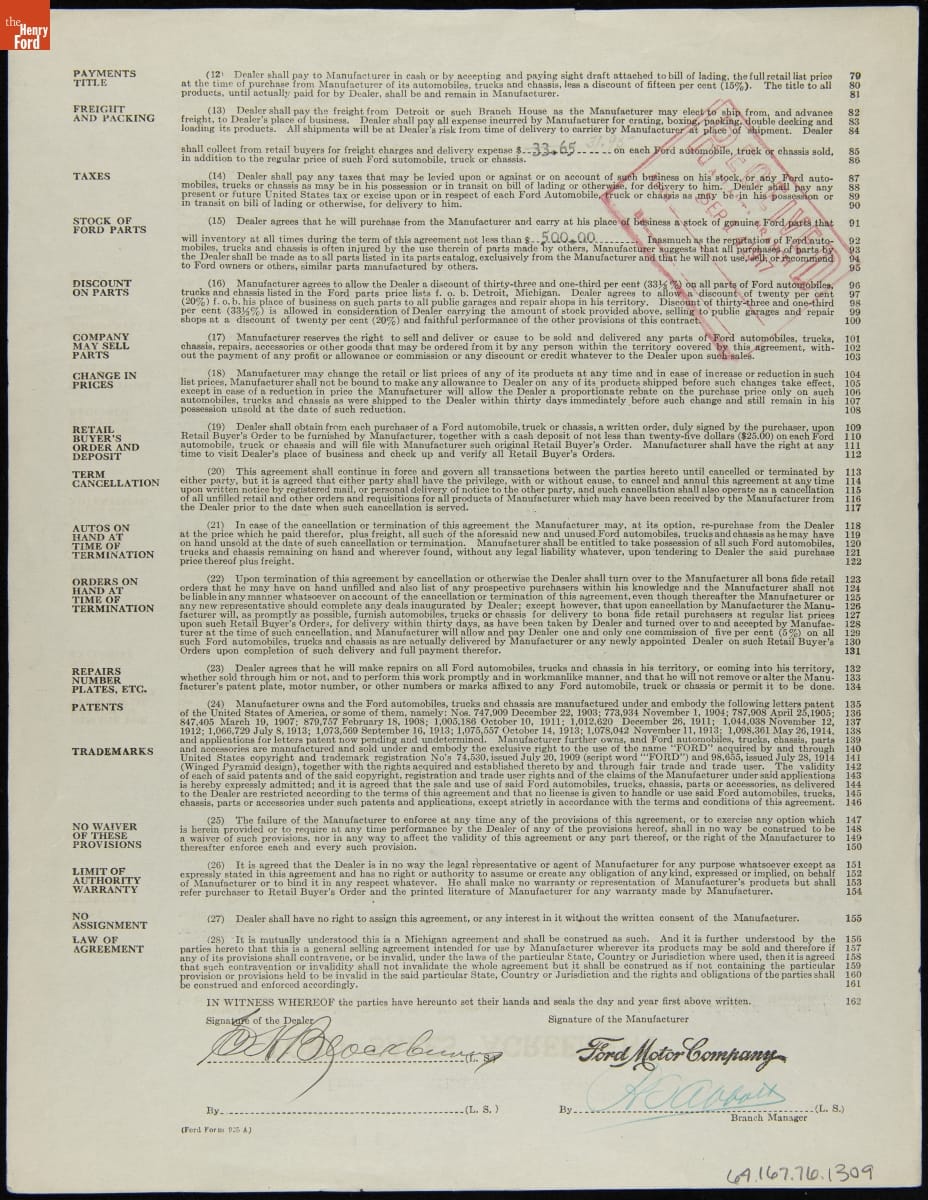 Though it operated some direct-sales offices in major cities, Ford Motor Company sold most of its Model T cars through franchise agreements with independent dealers. Each franchisee received the right to sell Ford cars within a specific territory. Ford encouraged dealers by offering discounts and rebates to high sellers. But low-selling dealers risked losing their territories.