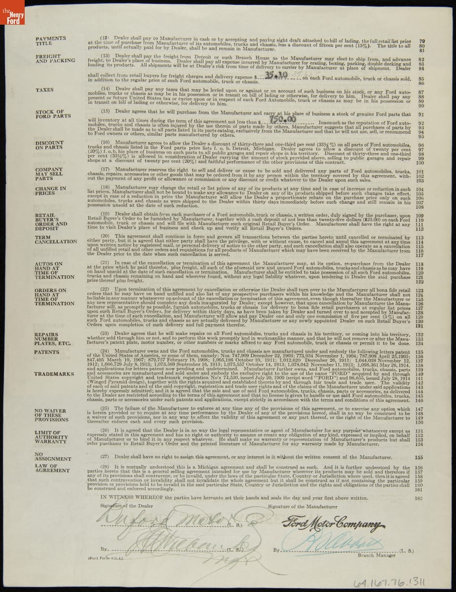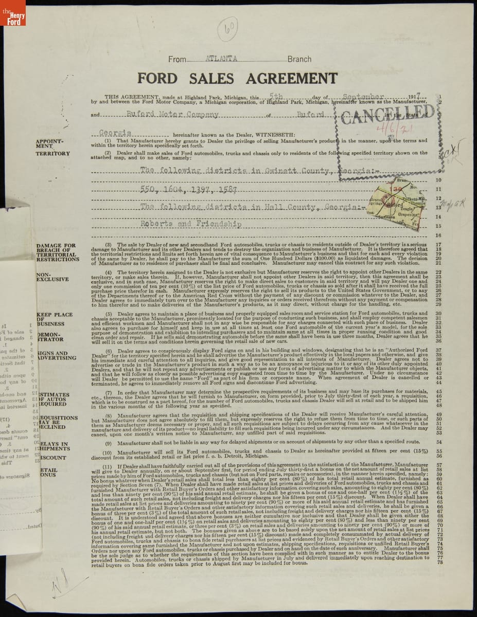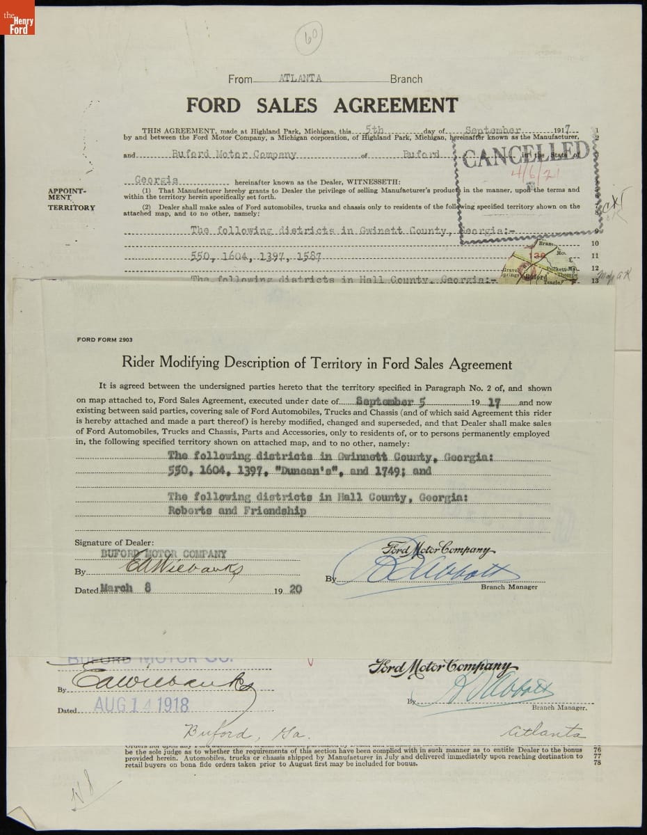 Cancelled Ford Sales Agreement for Buford Motor Company, Buford, Georgia, April 6, 1921