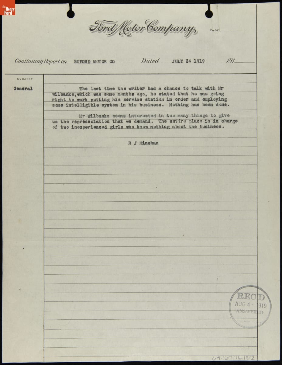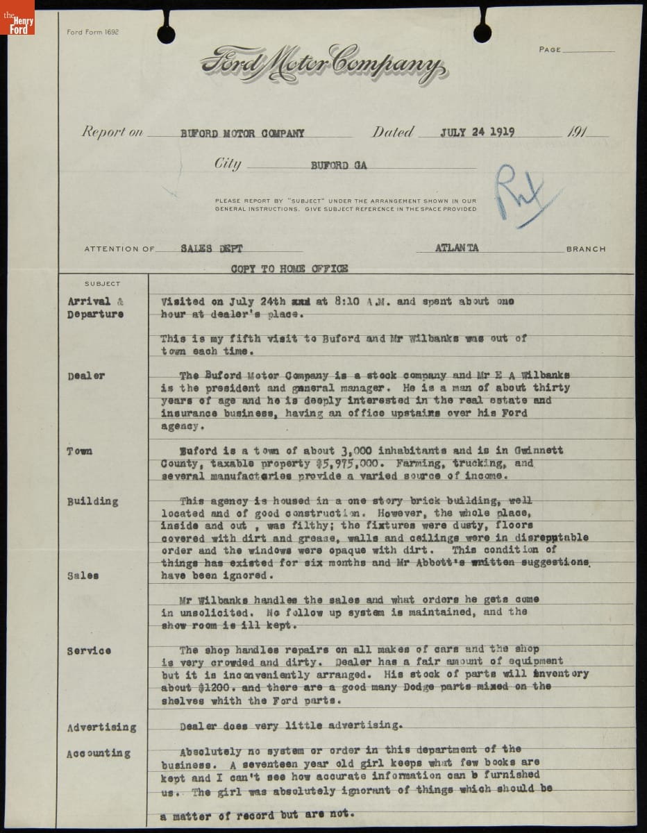 Manager Report of Buford Motor Company, Buford, Georgia, July 24, 1919