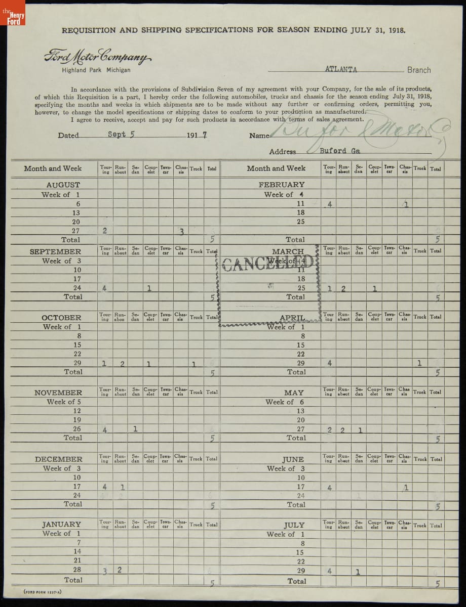 Cancelled Requisition Form for Benson Motor Company, Buford Motor Company, Buford, Georgia, April 1921
