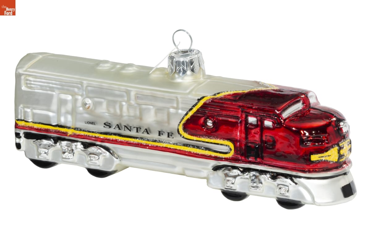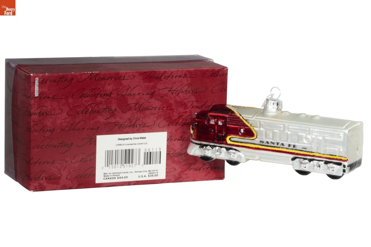 Hallmark / KEEPSAKE / ORNAMENTS / DECORATION DES FETES / BLOWN GLASS / CROWN REFLECTIONS / 1950 LIONEL SANTA FE / F3 DIESEL LOCOMOTIVE / For decorative use only. Not for young children / Concue a des fins decoratives seulement. Ne convient pas aux jeunes enfants.