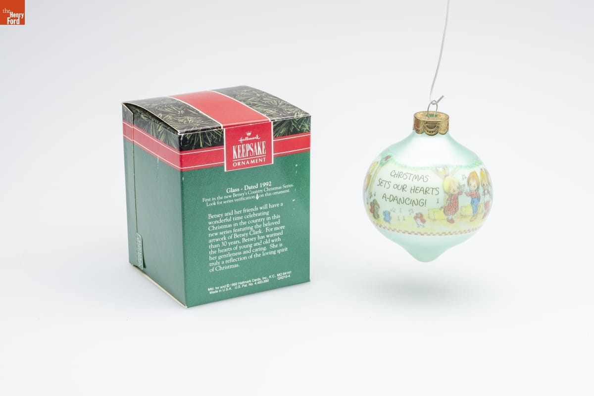Hallmark / KEEPSAKE / ORNAMENT / Glass - Dated 1992 / First in the new Betsey's Country Christmas Series. / Look for series verification 1 on this ornament. / Betsey and her friends will have a / wonderful time celebrating / Christmas in the country in this / new series featuring the beloved / artwork of Betsey Clark. For more / than 30 years, Betsey has warmed / the hearts of young and old with / her gentleness and caring. She is / truly a reflection of the loving spirit / of Christmas. / Mfd. for and (C) 1992 Hallmark Cards, Inc., K.C., MO 64141 / Made in U.S.A. U.S. Pat. No. 4,483,890 QX210-4