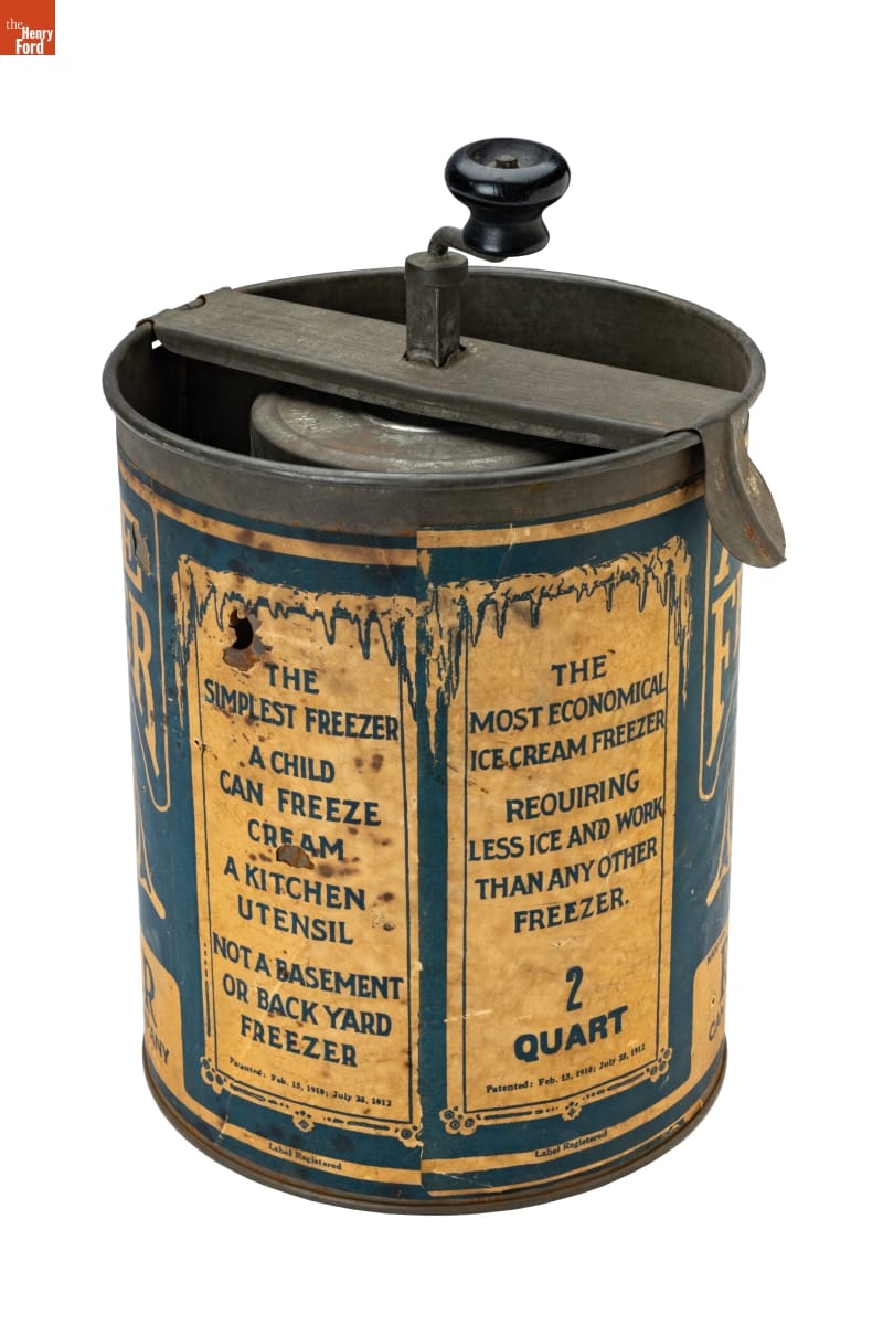 THE / SIMPLEST FREEZER / A CHILD / CAN FREEZE / CREAM / A KITCHEN UTENSIL / NOT A BASEMENT / OR BACK YARD / FREEZER / Patented: Feb. 15, 1910; July 23, 1912 / Label Registered
