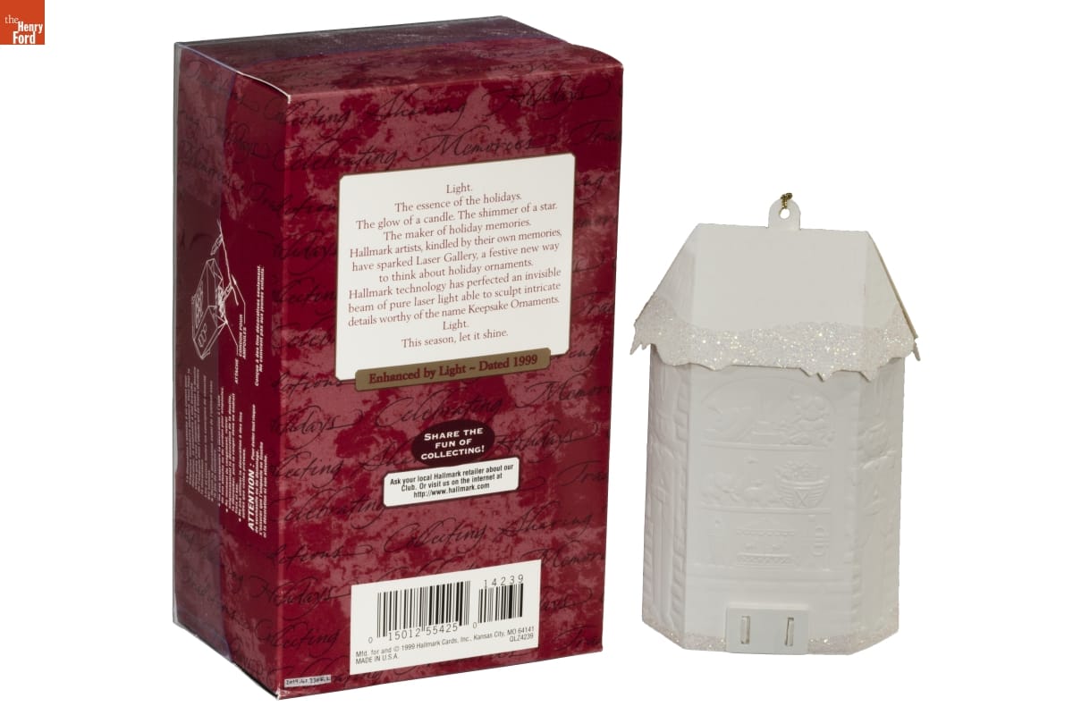 Light. / The essence of the holidays. / The glow of a candle. The shimmer of a star. / The maker of holiday memories. / Hallmark artists, kindled by their own memories, / have sparked Laser Gallery, a festive new way / to think about holiday ornaments. / Hallmark technology has perfected an invisible / beam of pure laser light able to sculpt intricate / details worthy of the name Keepsake Ornaments. / Light. / This season, let it shine. / Enhanced by Light - Dated 1999 / SHARE THE / FUN OF / COLLECTING! / Ask your local Hallmark retailer about our / Club. Or visit on the internet at / http://www.hallmark.com / Mfd. for and (C) 1999 Hallmark Cards, Inc., Kansas City, MO 64141 / MADE IN U.S.A. QLZ4239