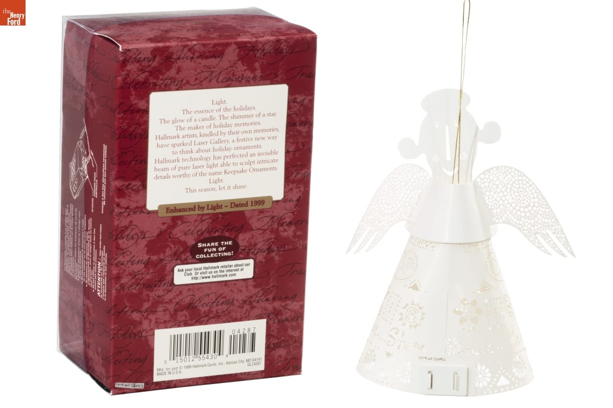 Light. / The essence of the holidays. / The glow of a candle. The shimmer of a star. / The maker of holiday memories. / Hallmark artists, kindled by their own memories, / have sparked Laser Gallery, a festive new way / to think about holiday ornaments. / Hallmark technology has perfected an invisible / beam of pure laser light able to sculpt intricate / details worthy of the name Keepsake Ornaments. / Light. / This season, let it shine. / Enhanced by Light - Dated 1999 / SHARE THE / FUN OF / COLLECTING! / Ask your local Hallmark retailer about our / Club. Or visit on the internet at / http://www.hallmark.com / Mfd. for and (C) 1999 Hallmark Cards, Inc., Kansas City, MO 64141 / MADE IN U.S.A. QLZ4287