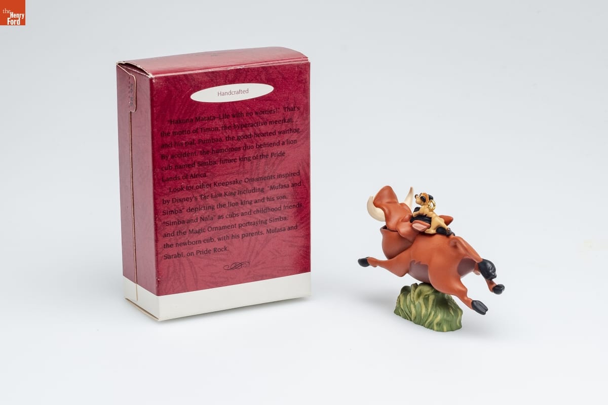 Handcrafted / "Hakuna Matata--Life with no worries!" That's / the motto of Timon, the hyperactive meerkat, / and his pal, Pumbaa, the good-hearted warthog. / By accident, the humorous duo befriend a lion / cub named Simba, future king of the Pride / Lands of Africa. / Look for other Keepsake Ornaments inspired / by Disney's The Lion King including "Mufasa and / Simba" depicting the lion king and son, / "Simba and Nala" as cubs and childhood friends, / and the Magic Ornament portraying Simba, / the newborn cub, with his parents, Mufasa and / Sarabi, on Pride Rock.