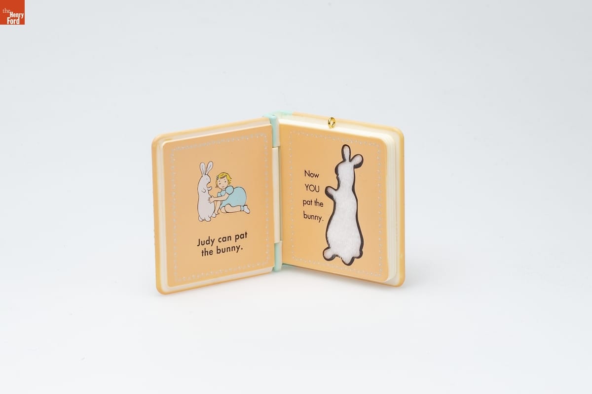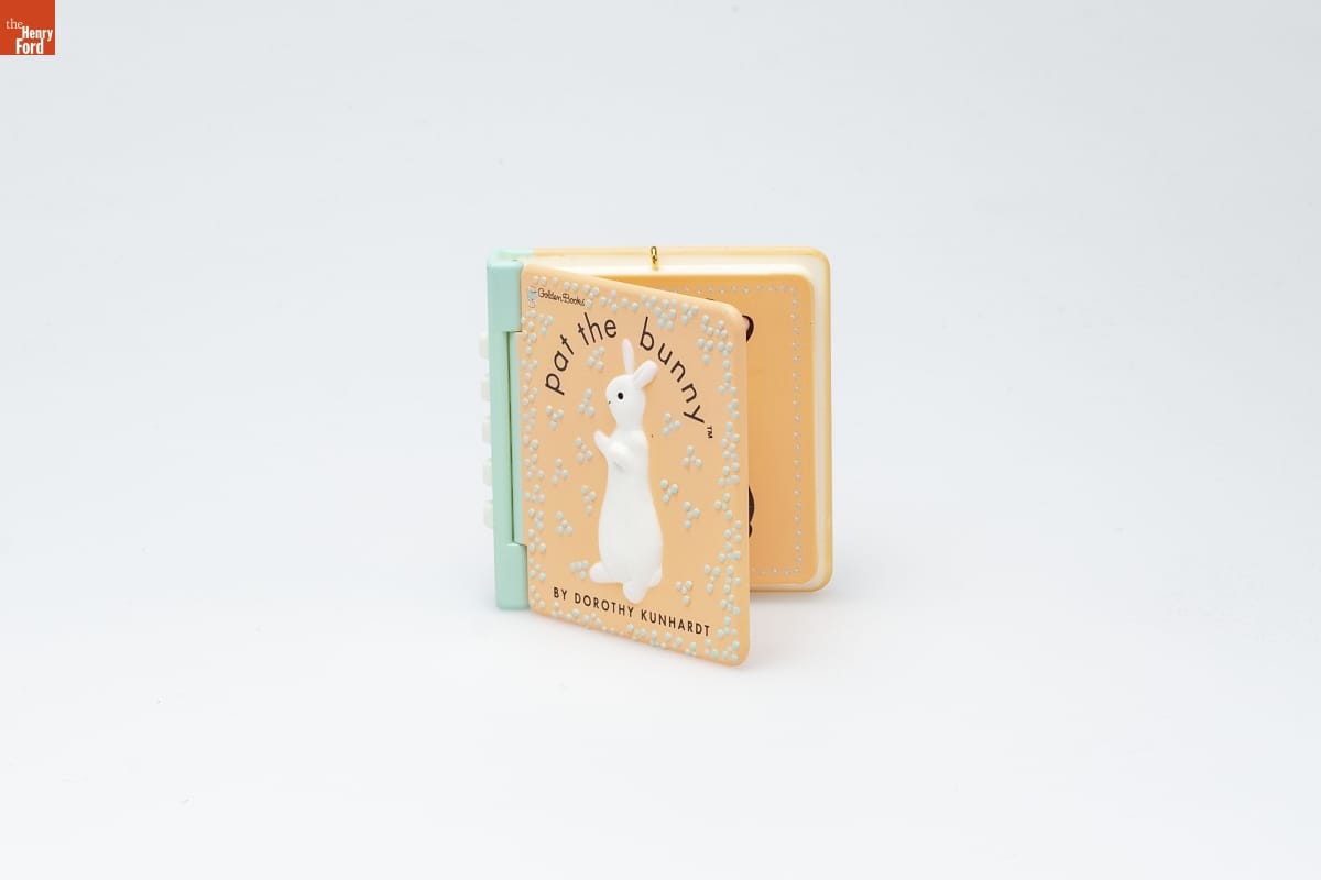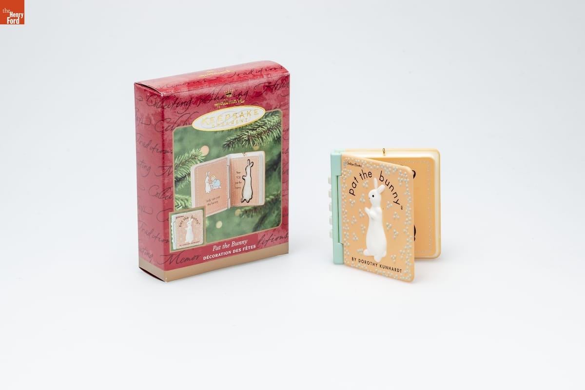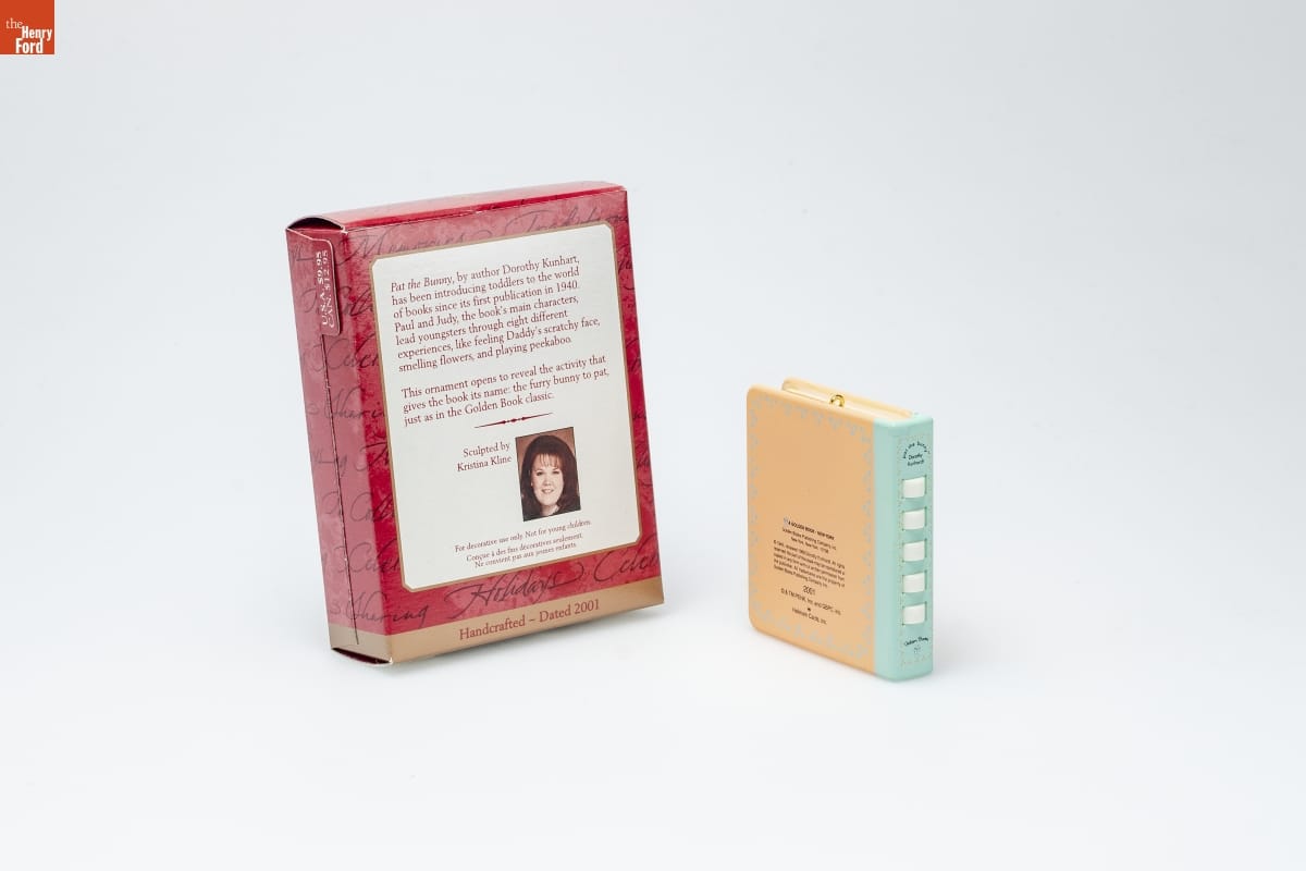 Pat the Bunny, by author Dorothy Kunhart [sic], / has been introducing toddlers to the world / of books since its first publication in 1940. / Paul and Judy, the book's main characters, / lead youngsters through eight different / experiences, like feeling Daddy's scratchy face, / smelling flowers, and playing peekaboo. / This ornament opens to reveal the activity that / gives the book its name: the furry bunny to pat, / just as in the Golden Books classic. / Sculpted by / Kristina Kline / For decorative use only. Not for young children. / Concue a des fins decoratives seulement. / Ne convient pas aux jeunes enfants. / Handcrafted - Dated 2001