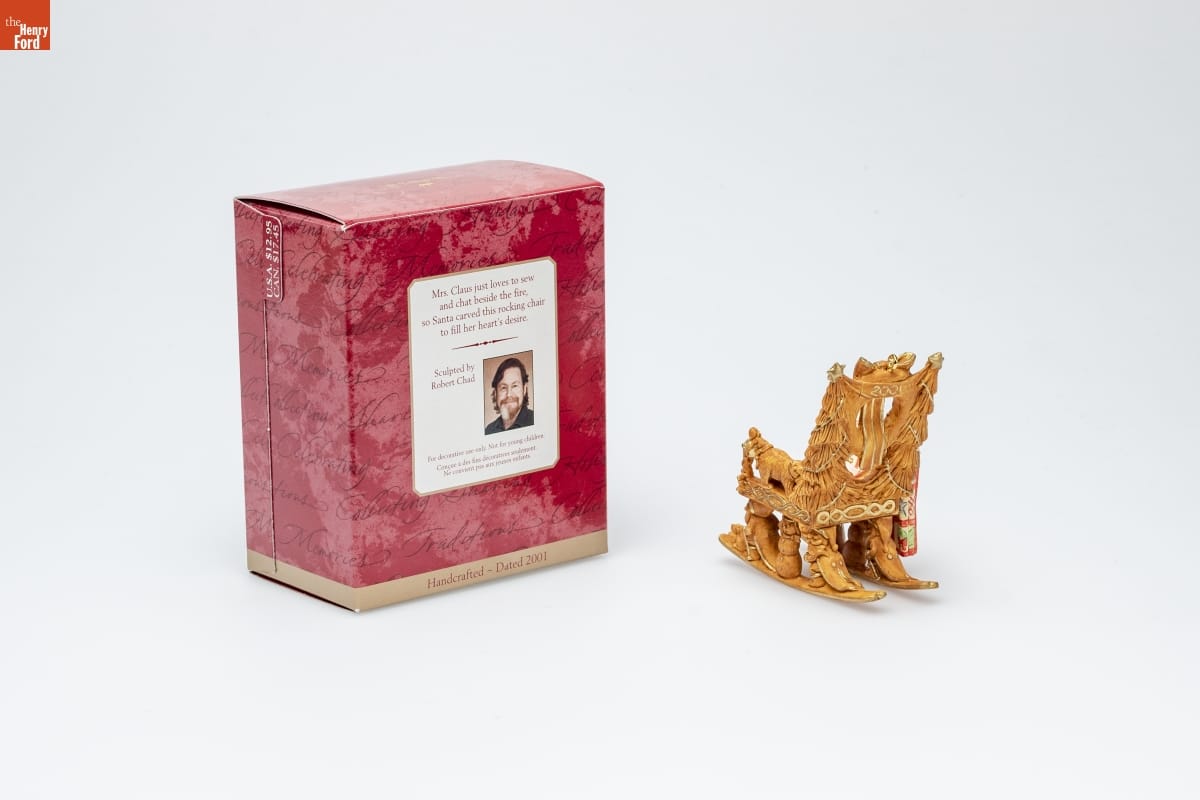 Mrs. Claus just loves to sew / and chat beside the fire, / so Santa carved this rocking chair / to fill her heart's desire. / Sculpted by / Robert Chad / For decorative use only. Not for young children. / Concue a des fins decoratives seulement. / Ne convient pas aux jeunes enfants. / Handcrafted - Dated 2001